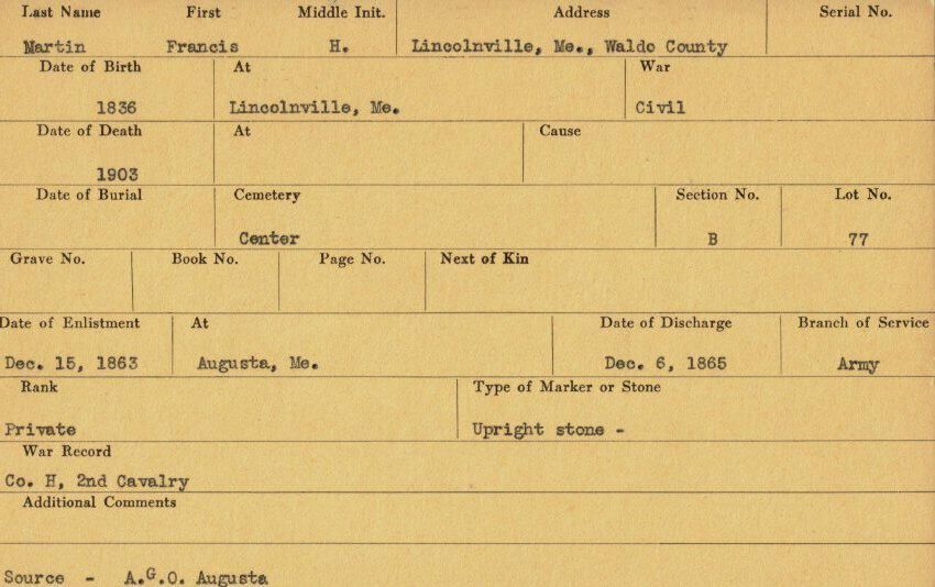 Military records of Francis H. Martin who served in the Civil War.Relationships