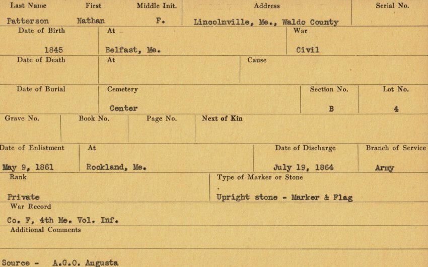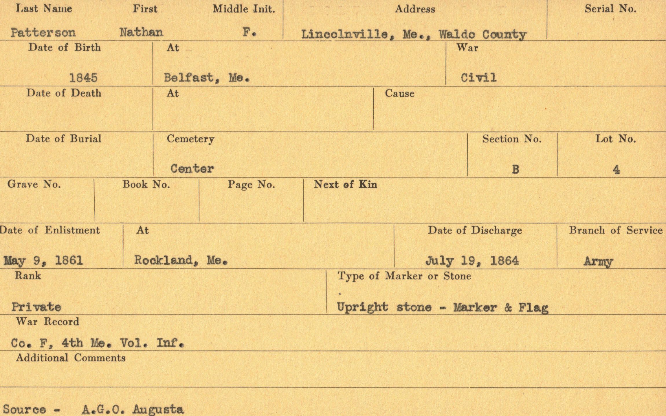 Military records of Nathan F. Patterson who served in the Civil War.Relationships