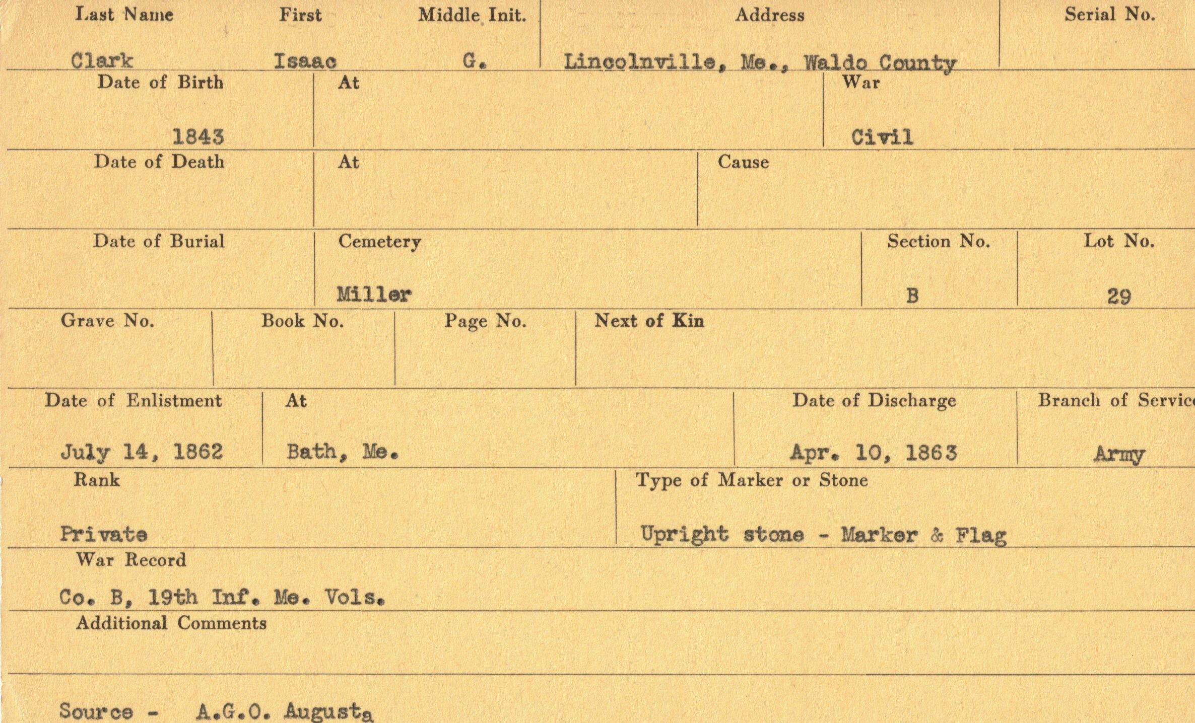 Military records of Isaac G. Clark who served in the Civil War.Relationships