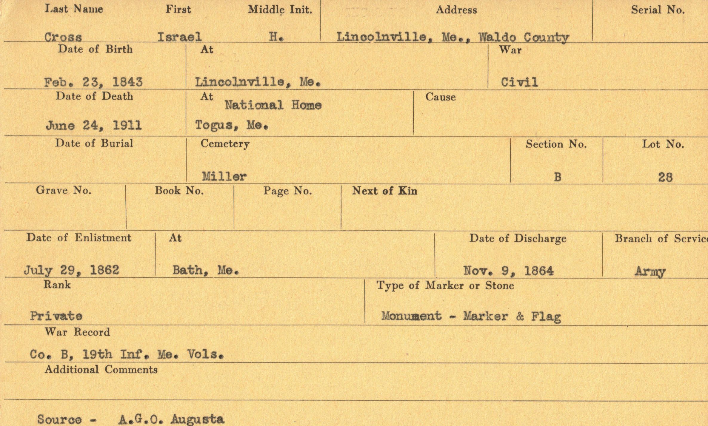 Military records of Israel H. Cross who served in the Civil War.Relationships