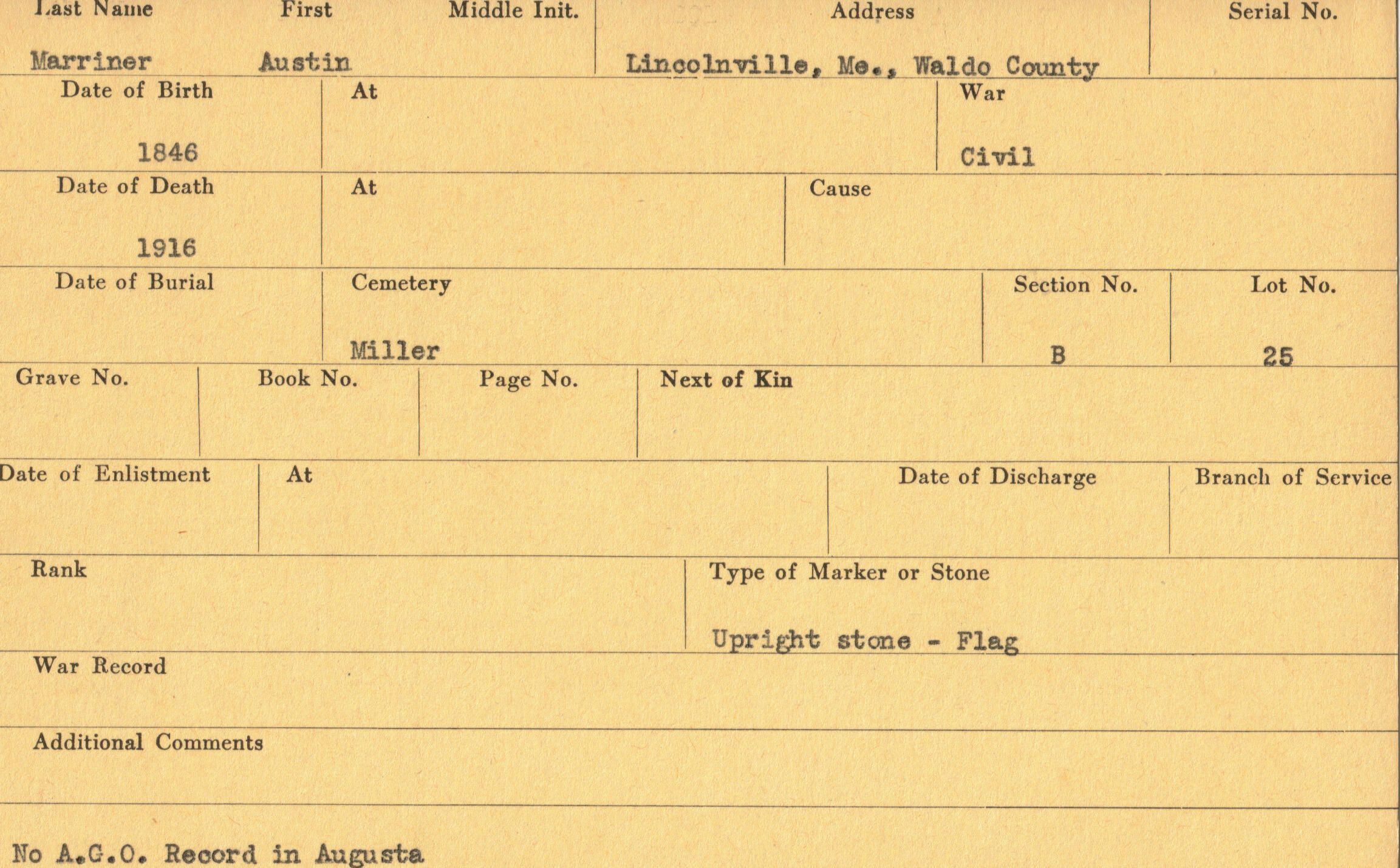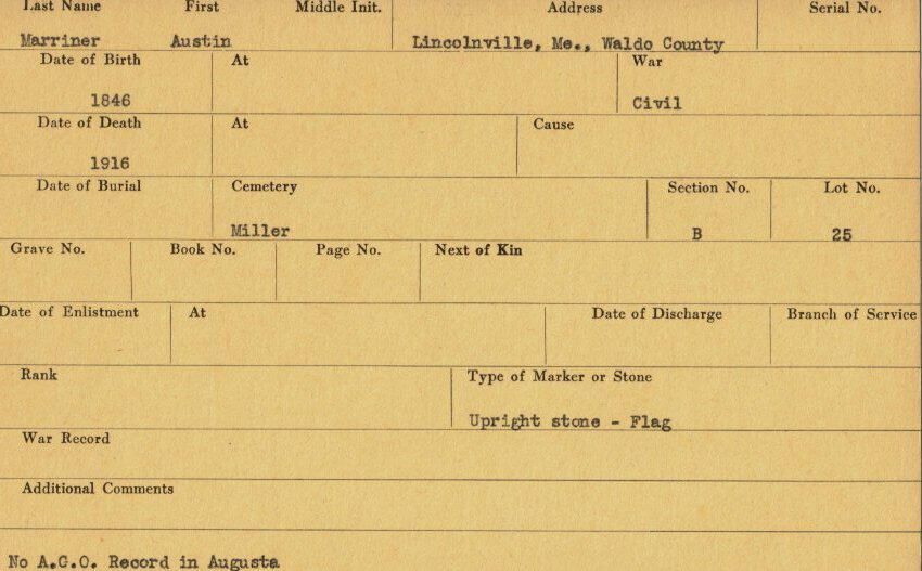 Military records of Austin Mariner who served in the Civil War.Relationships
