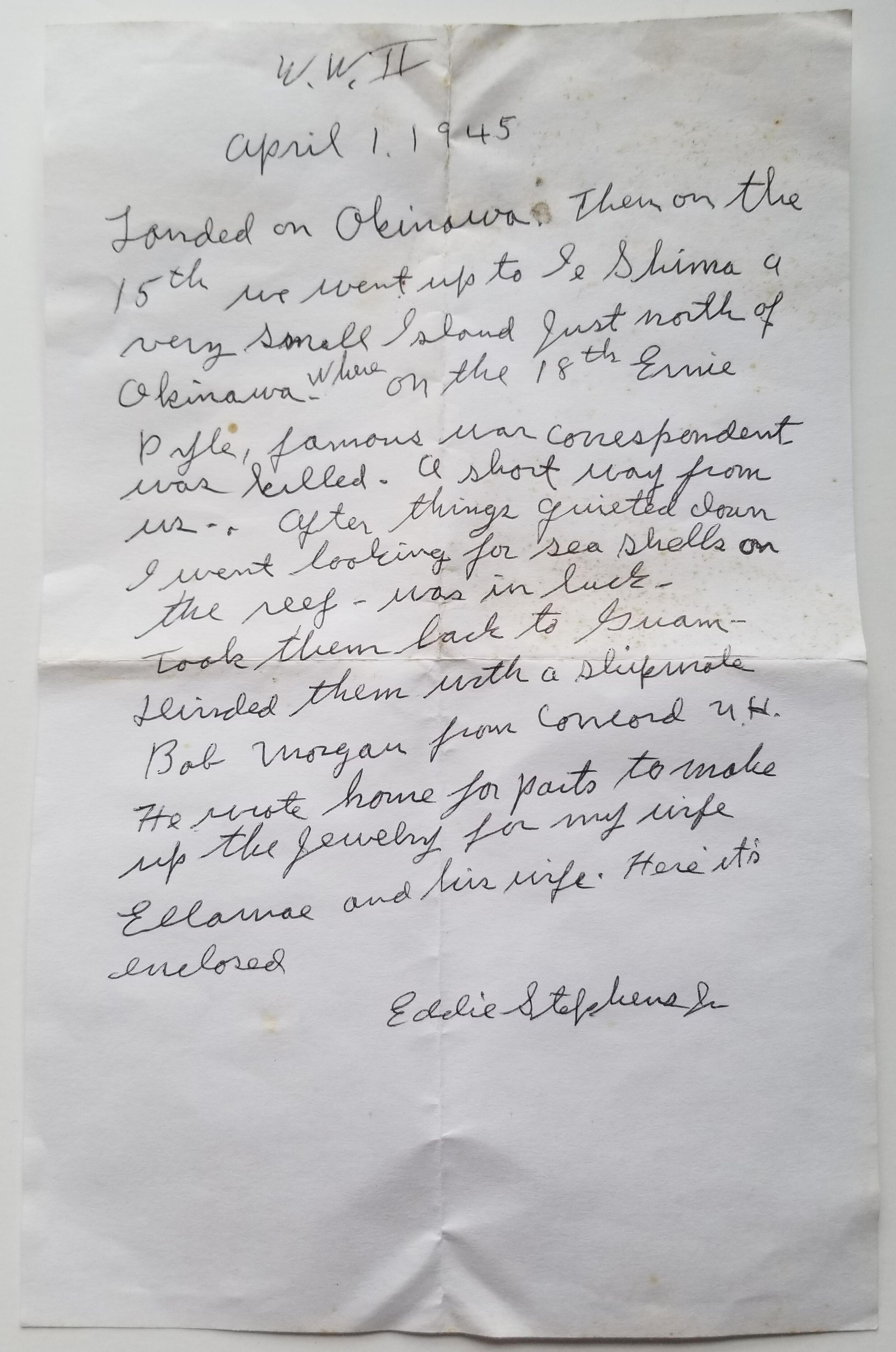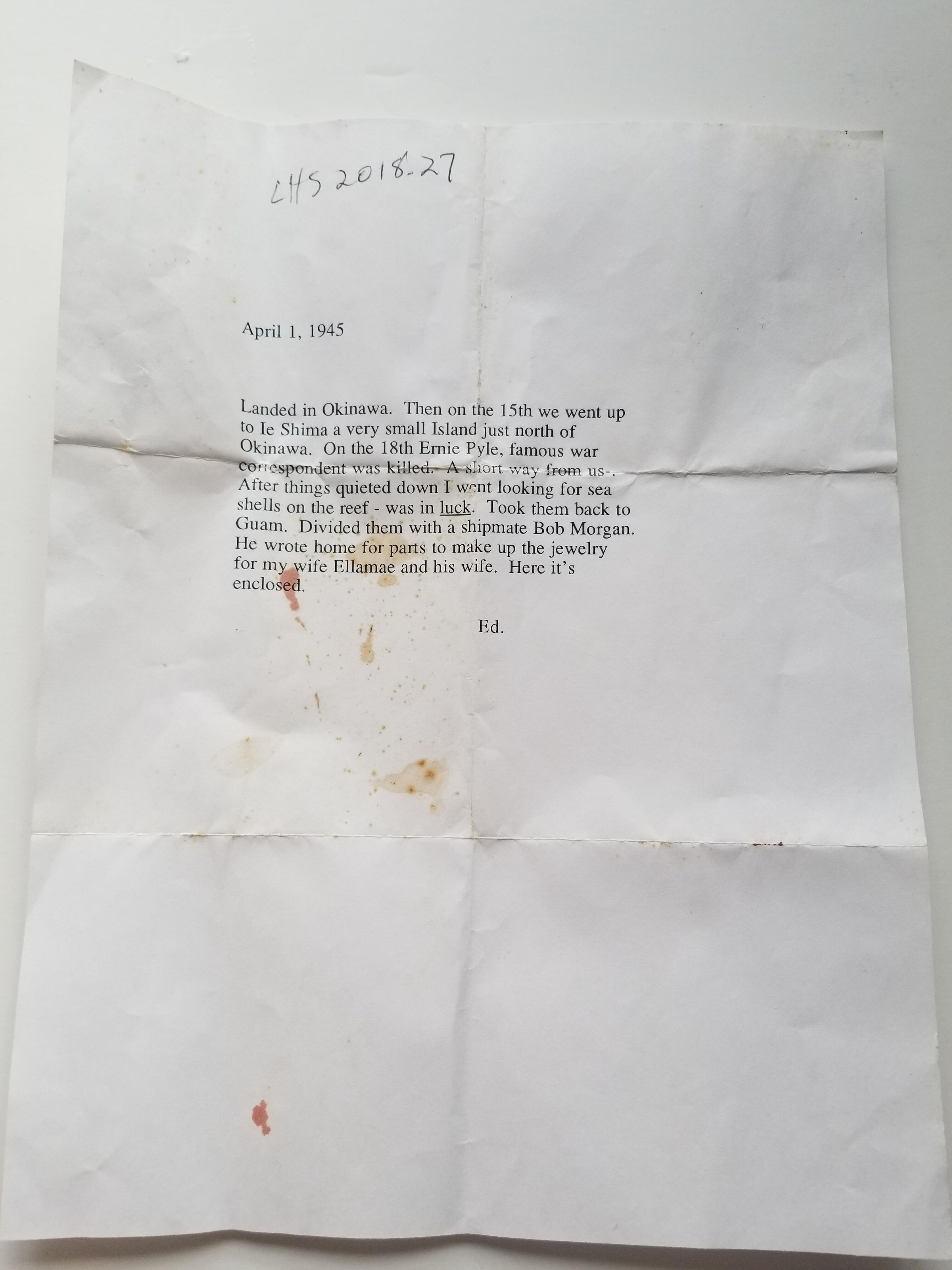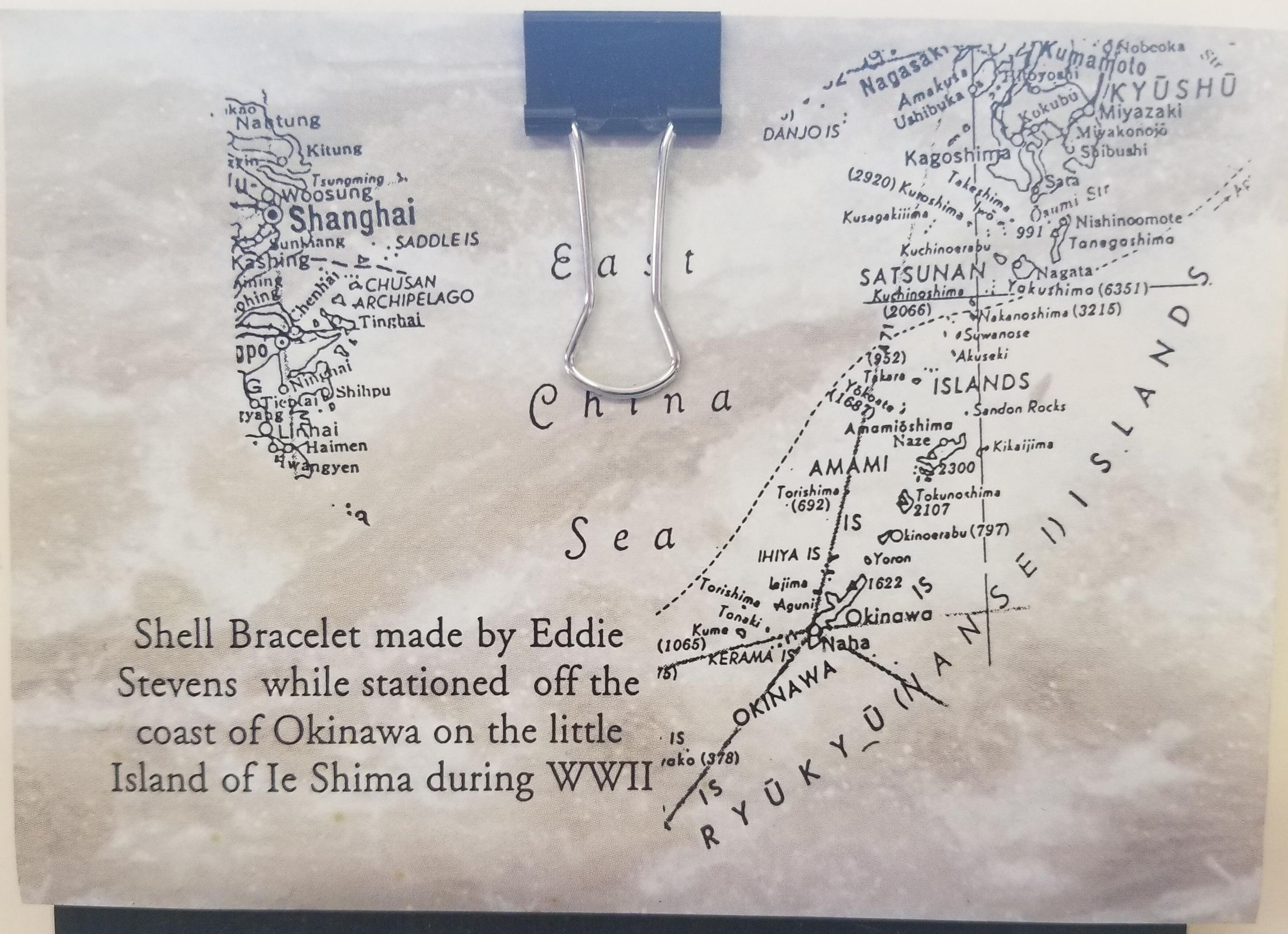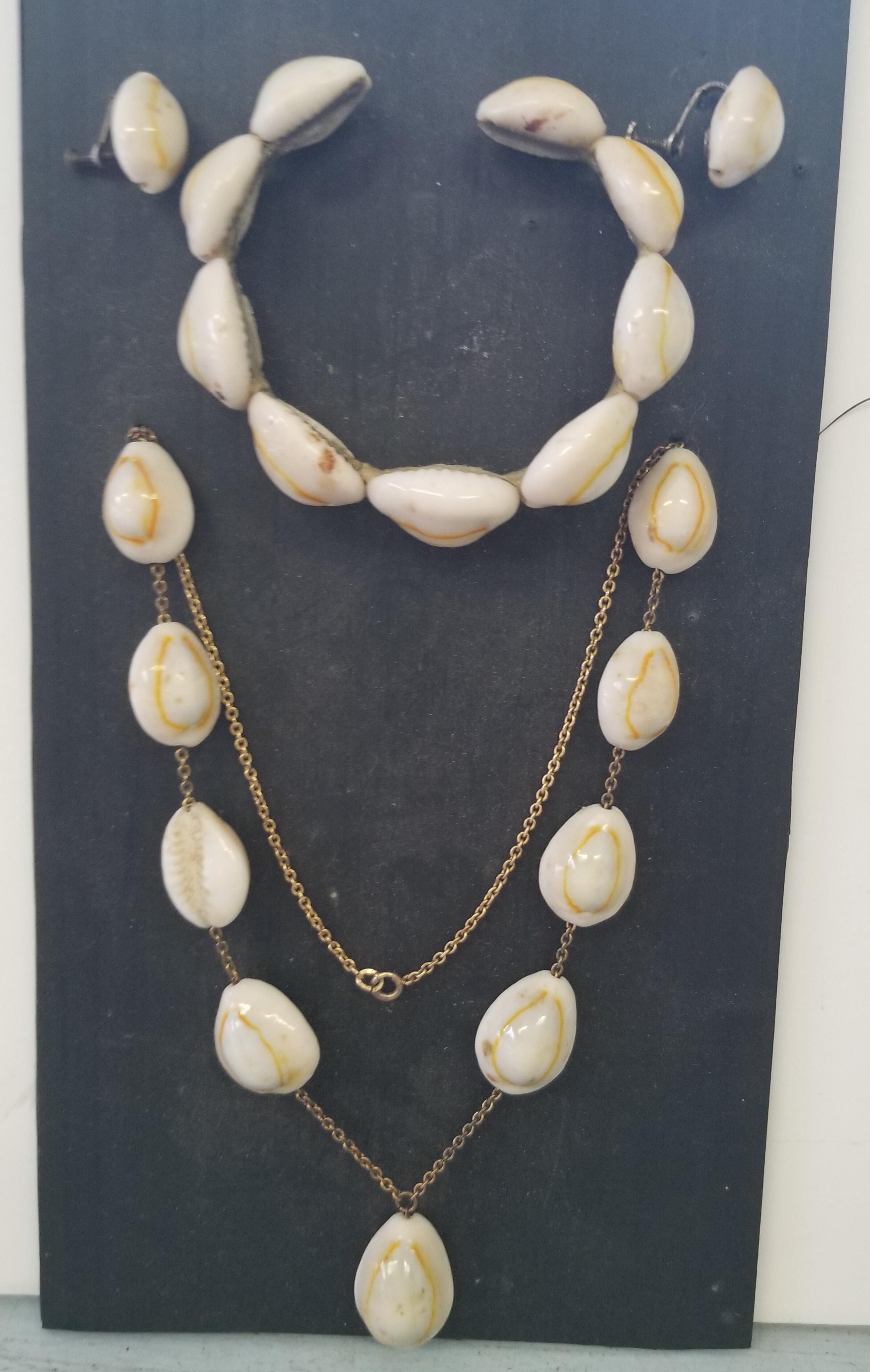 bracelet, necklace and pair of screwback earrings made with shells found on Pacific island during WW II