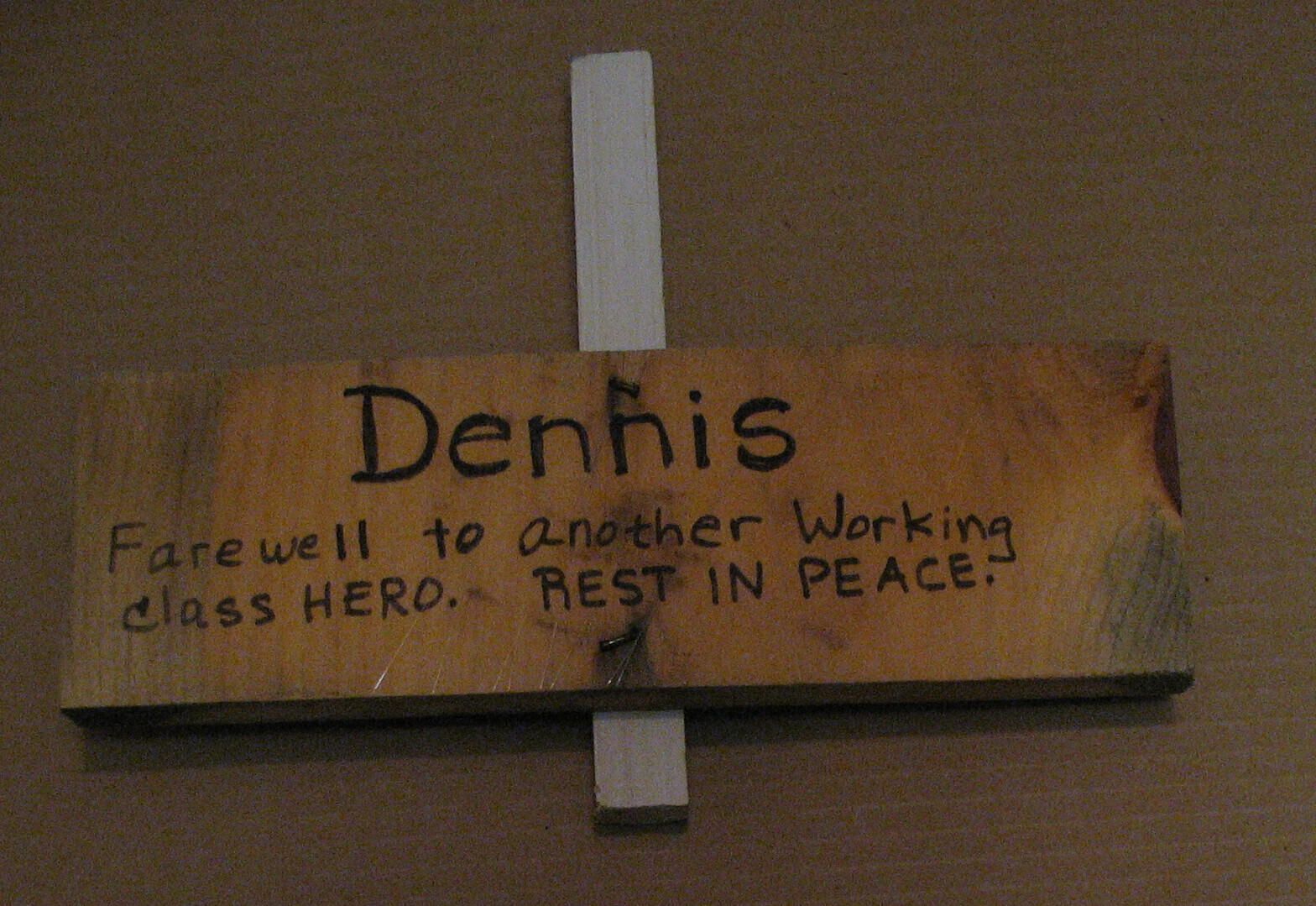 handlettered board reads: "Dennis Farewell to another Working class hero. Rest in peace."