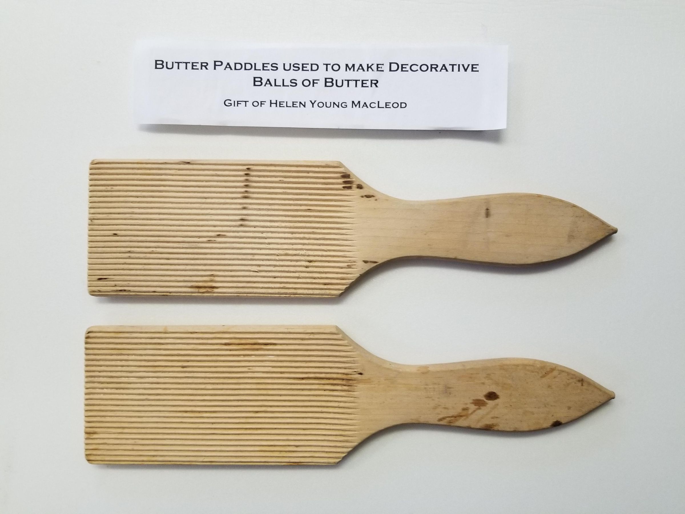 Two wooden paddles with grooves carved into them. Used to make decorative butter balls by rolling butter between them.Relationships