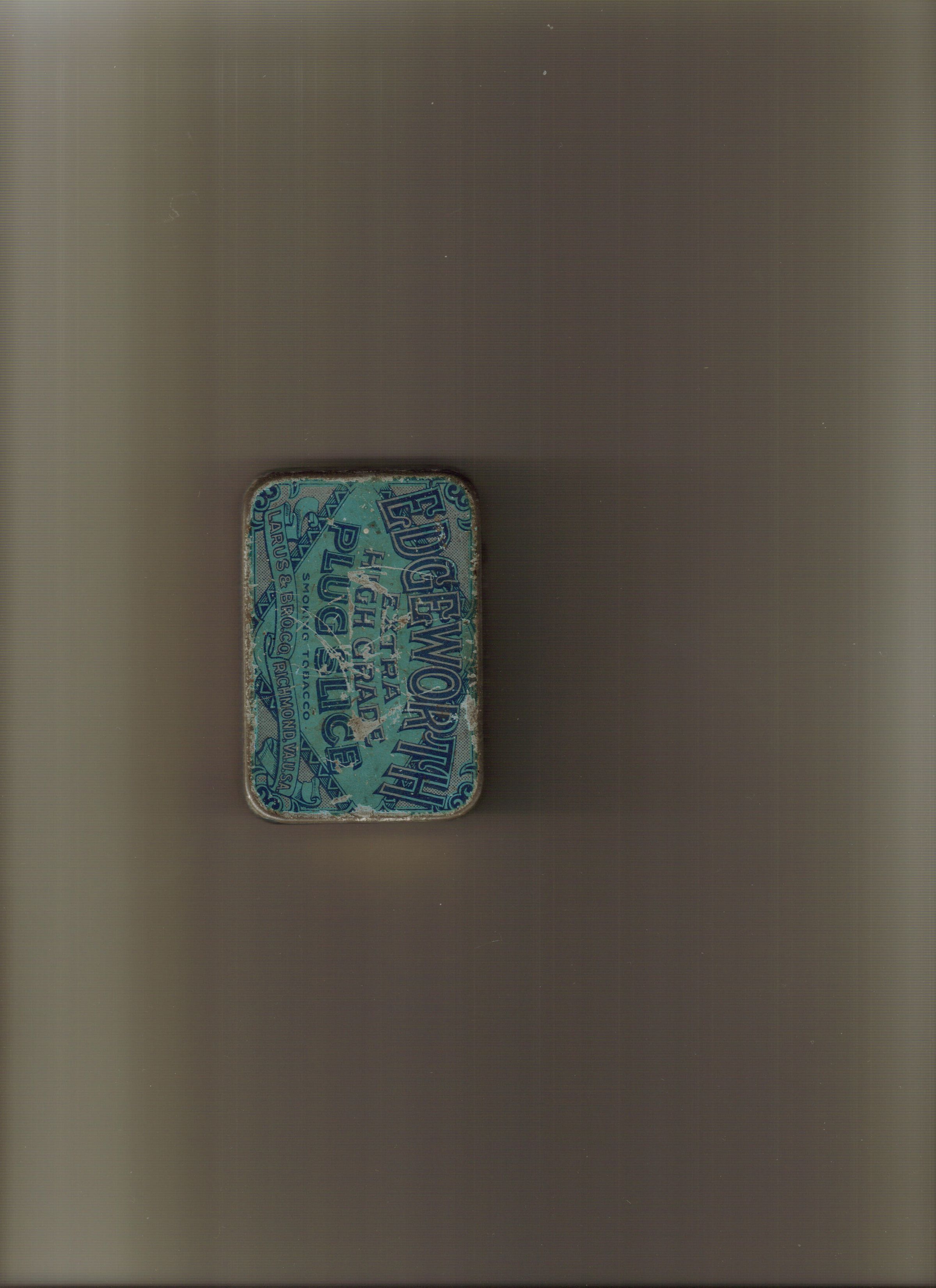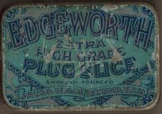 Tobacco plug tin with Edgeworth Extra High Grade Plug Slice on cover.