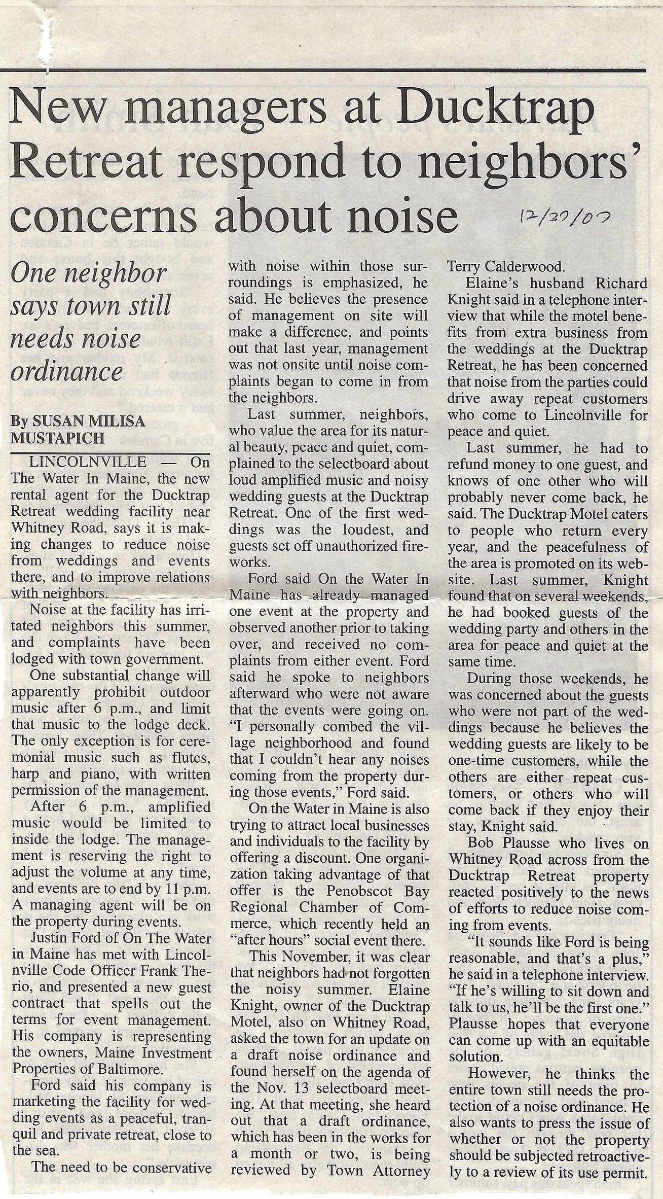 Dec. 27, 2007 article about noise complaints at Ducktrap Retreat