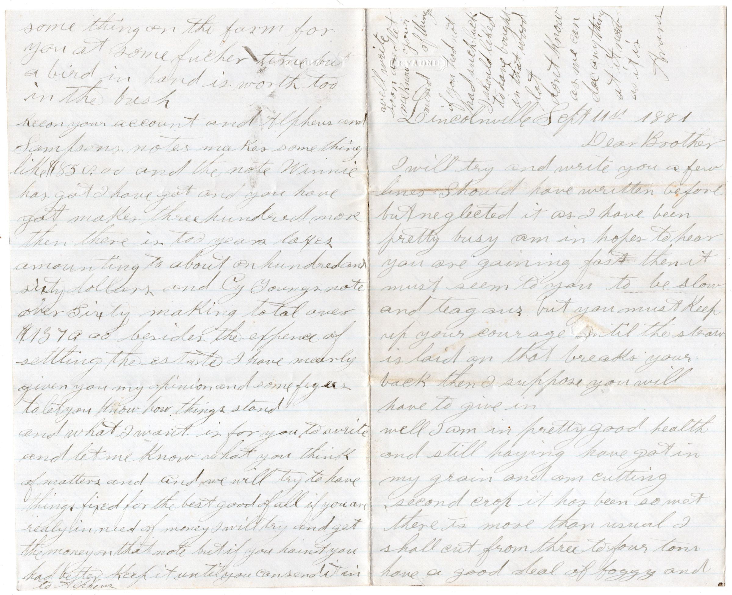 Knight Collection - 1881 Letter; Dated September 11th; Written by Avans Knight to his brother Arno Knight; Arno is working in Colorado and is recovering from having his leg broken badly in a mine explosion