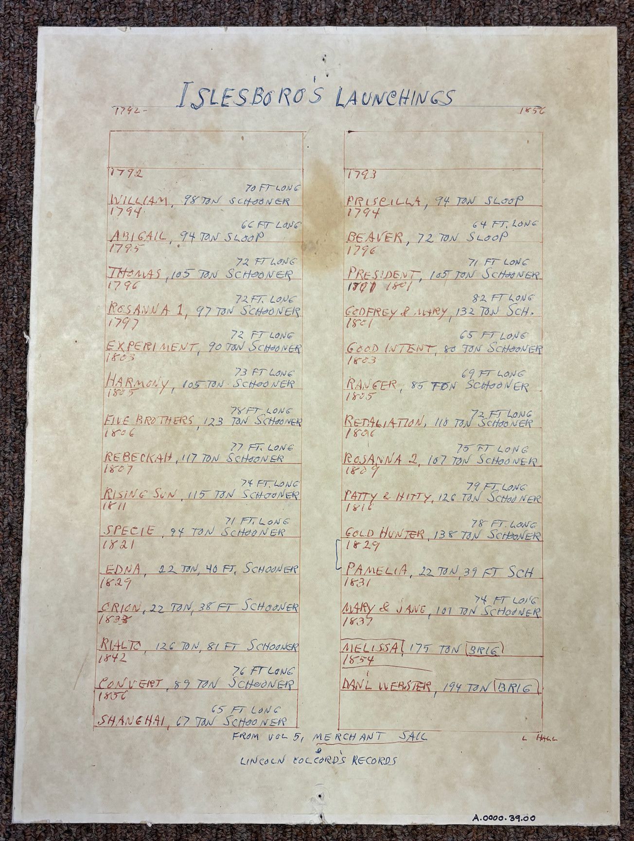 Islesboro Launchings Handwritten poster by Lesley "Cappy" Hall; from Vol. 5 "Merchant Sail" & Lincoln Colcord's Records; covers the years from 1792-1856Relationships