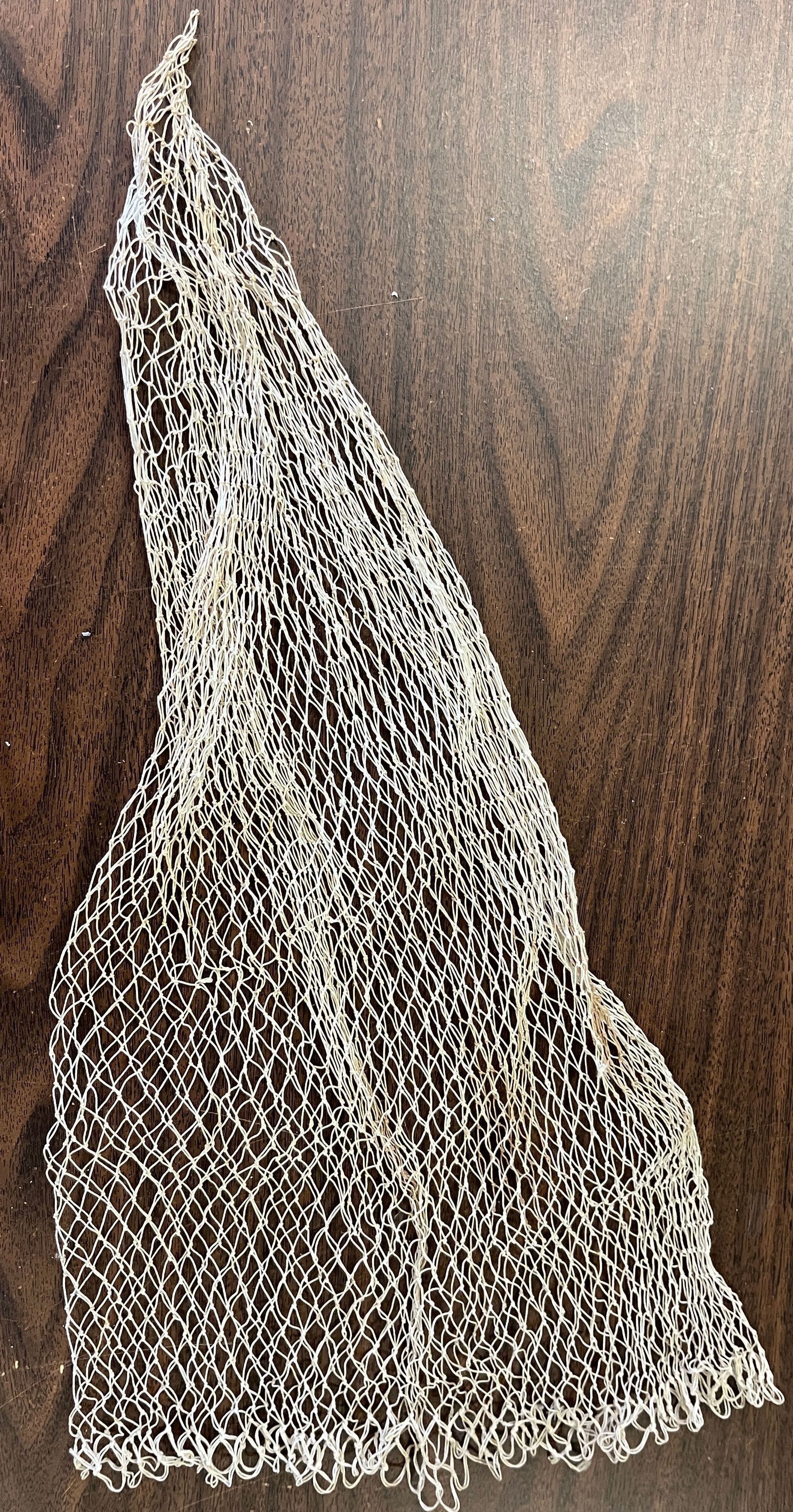 fine seine twine handmade fishing net 23" long by about 16" wide at top narrowing at bottom
