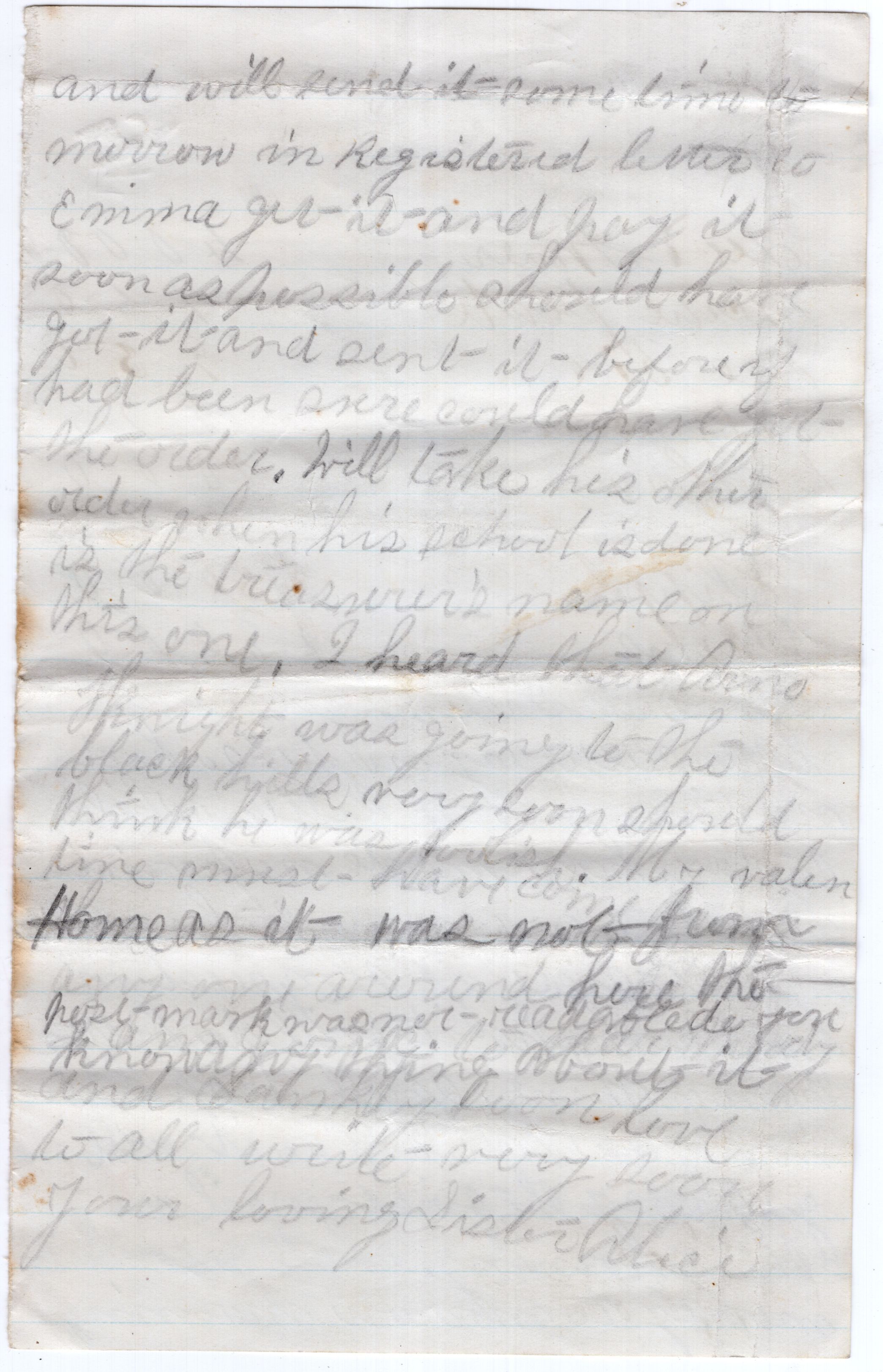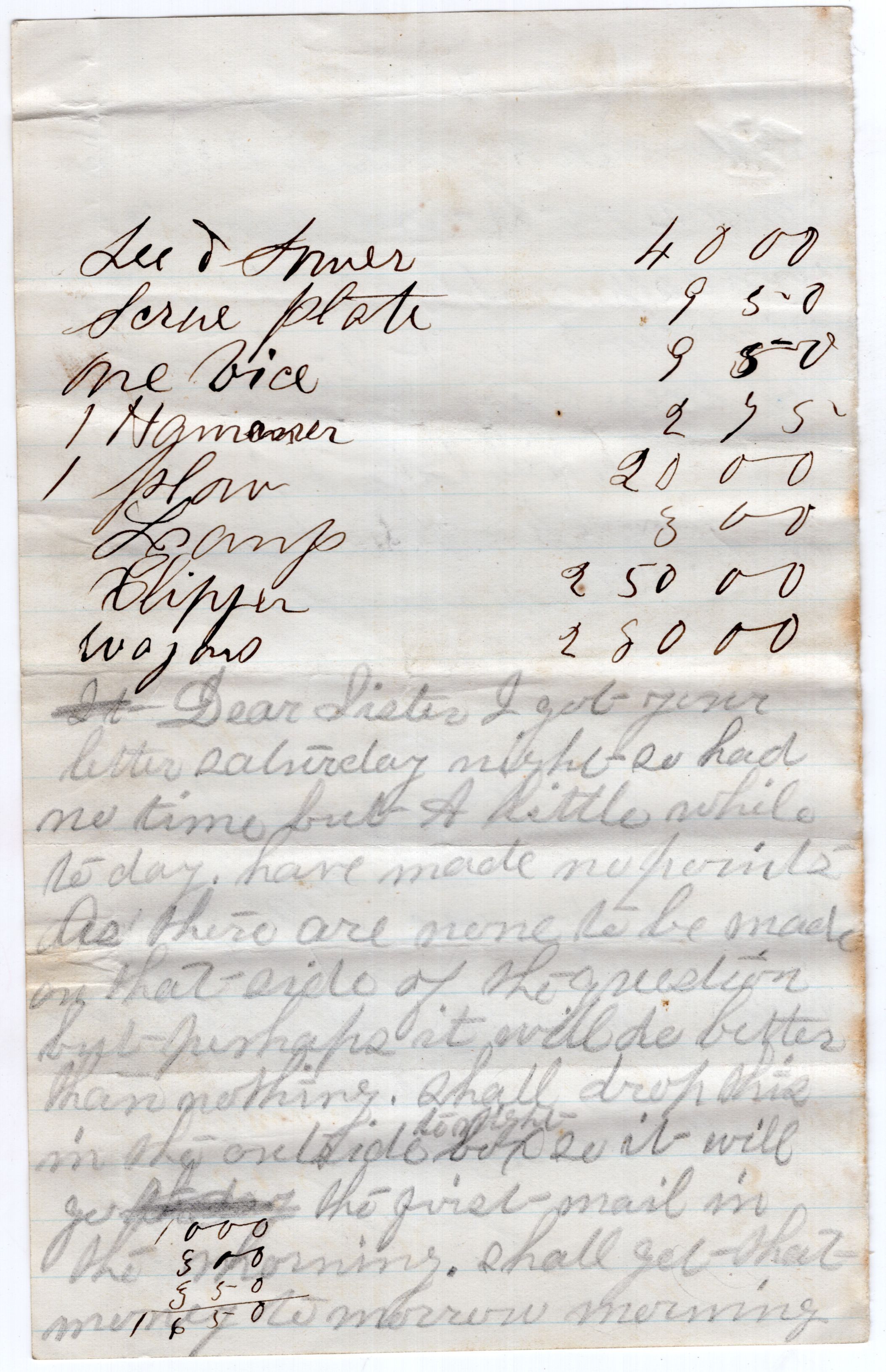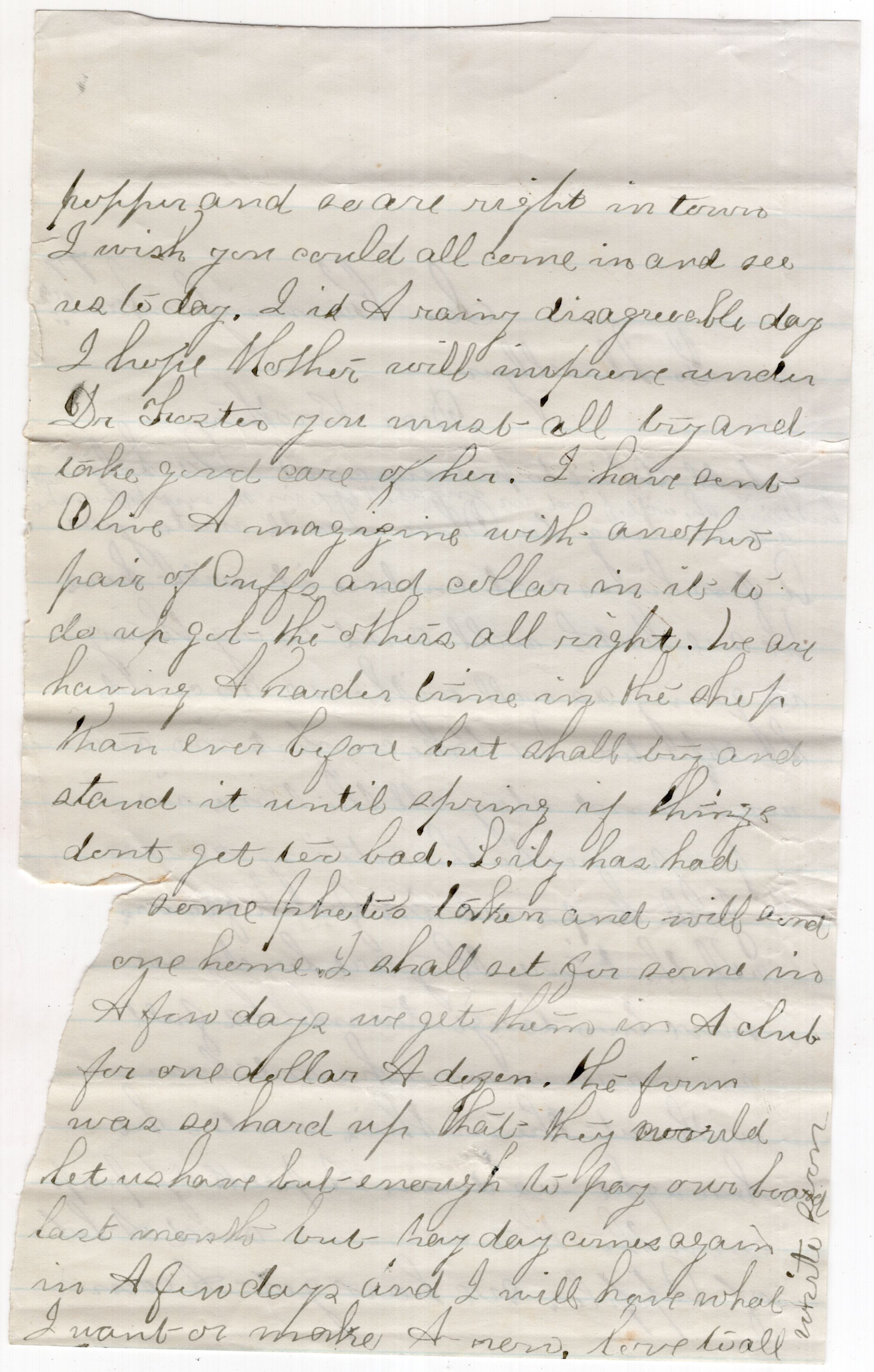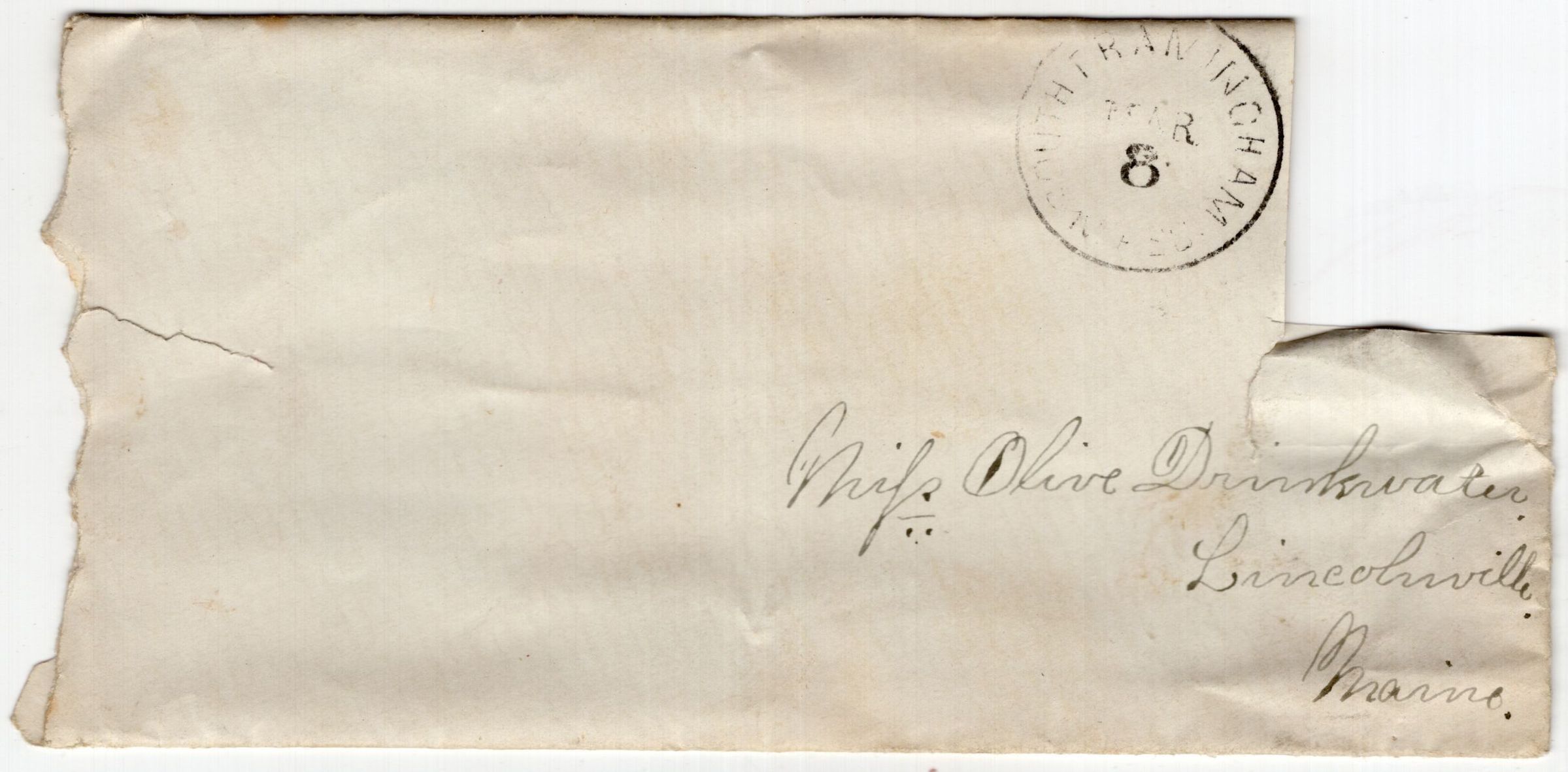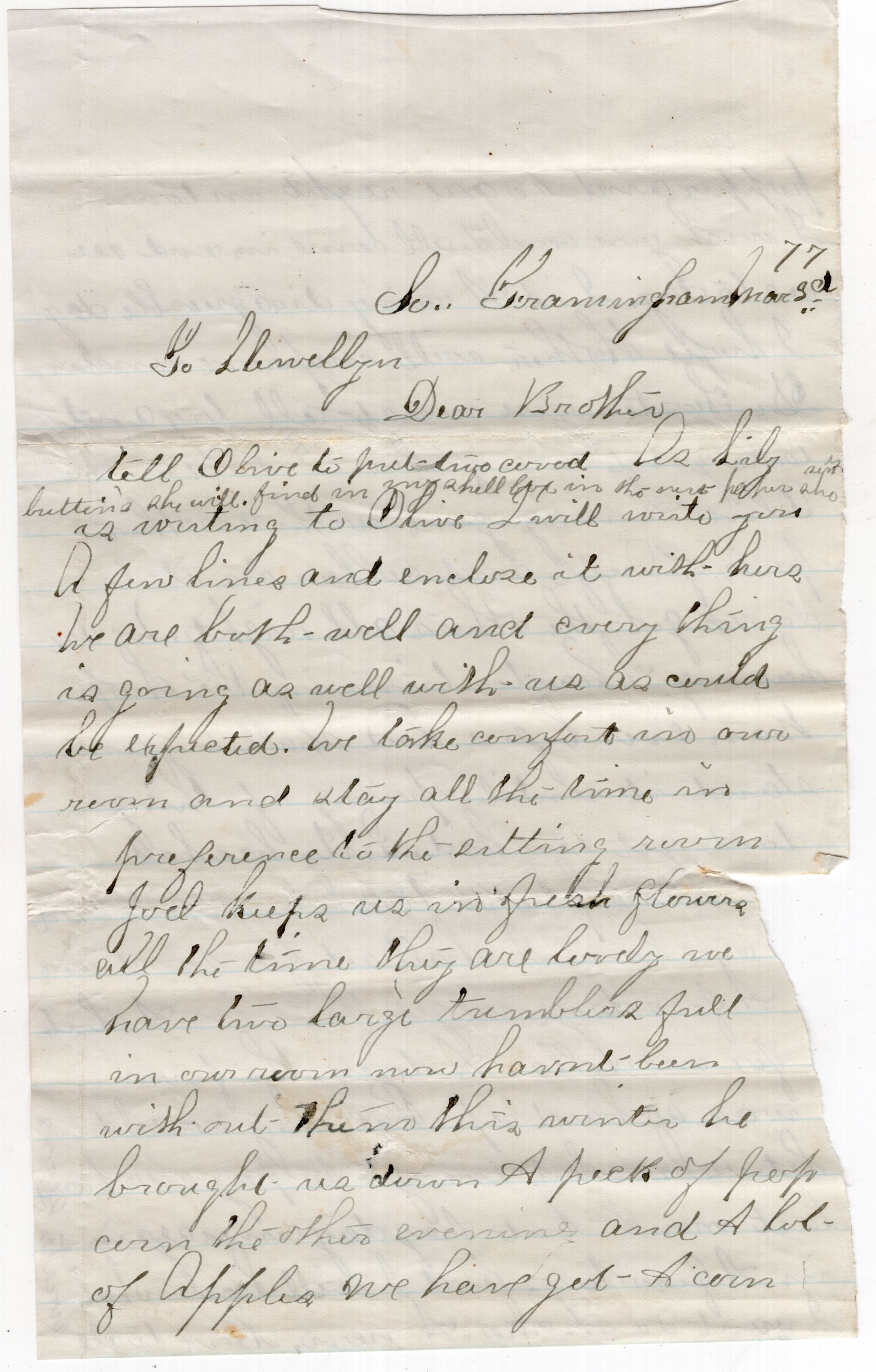 Knight Collection 1877 Letter; Dated March 30th; Written by Alice Drinkwater to her brother Llewellyn and sister Olive Drinkwater; Alice is working at a hat factory in South Framingham