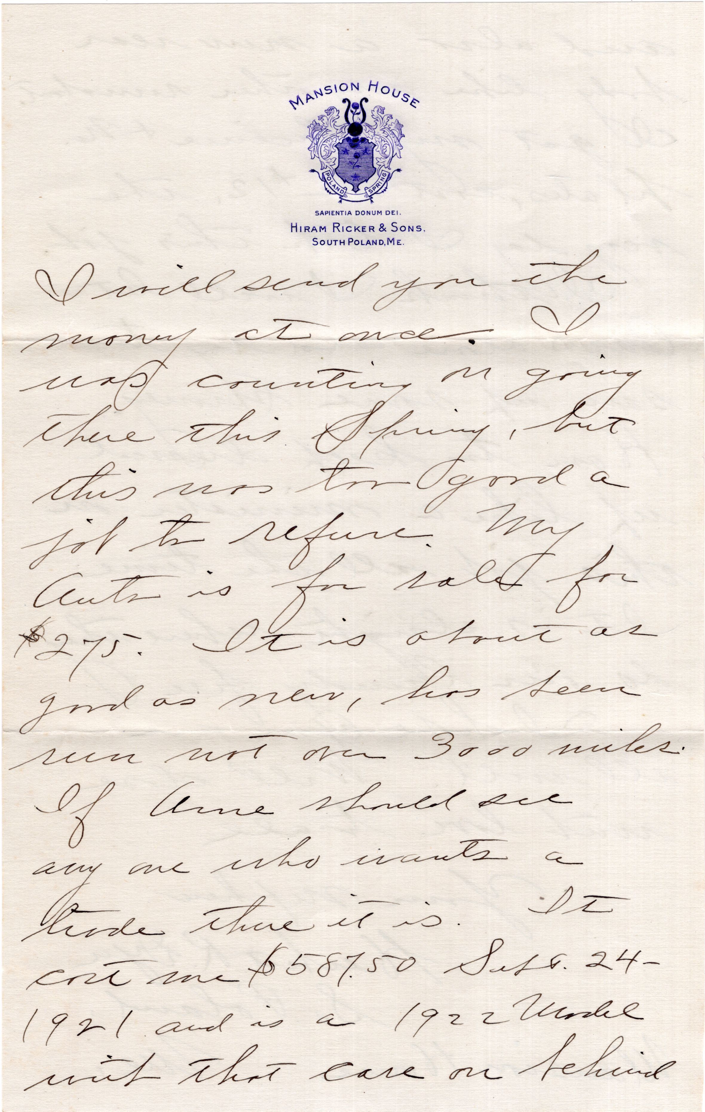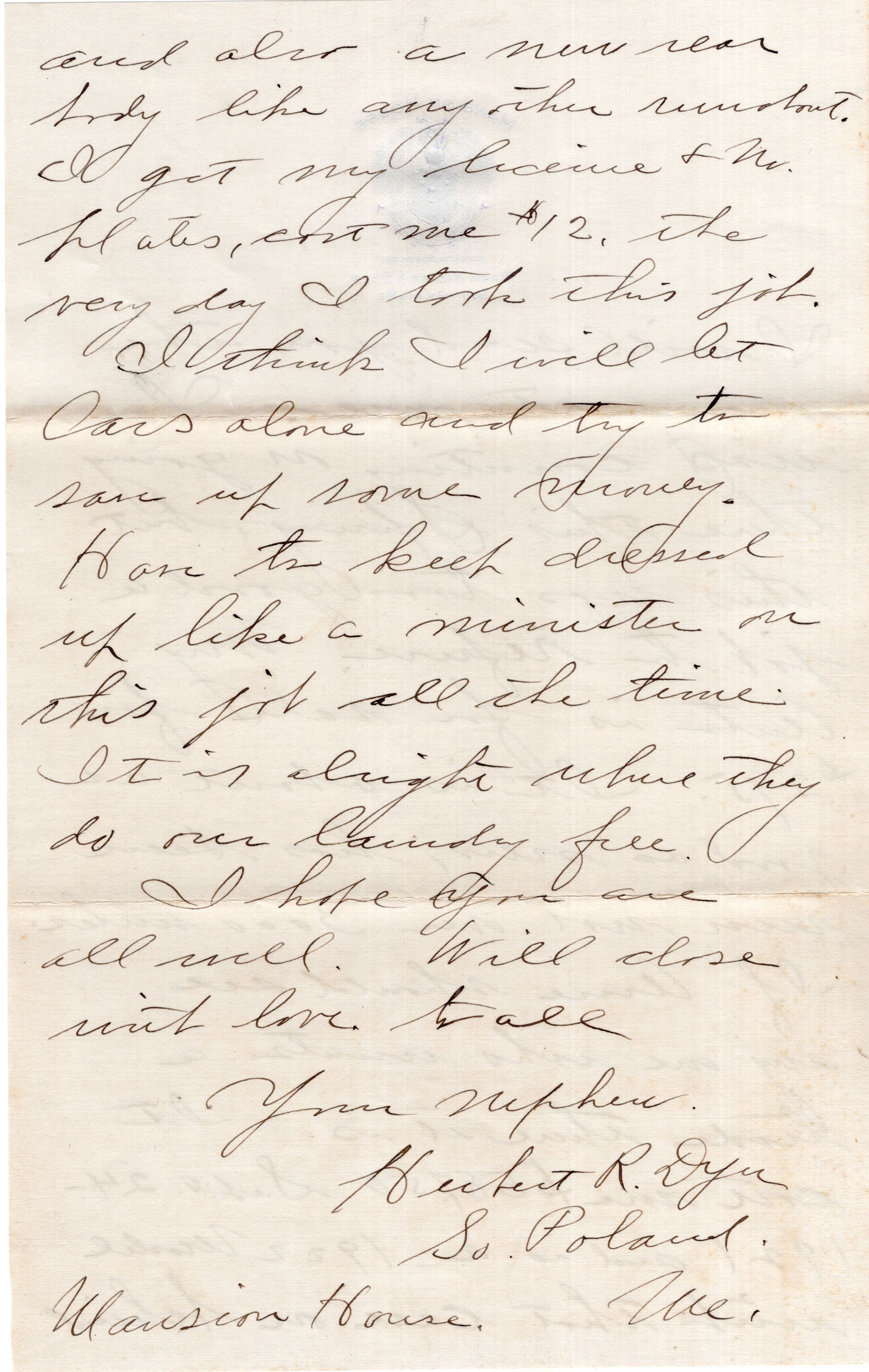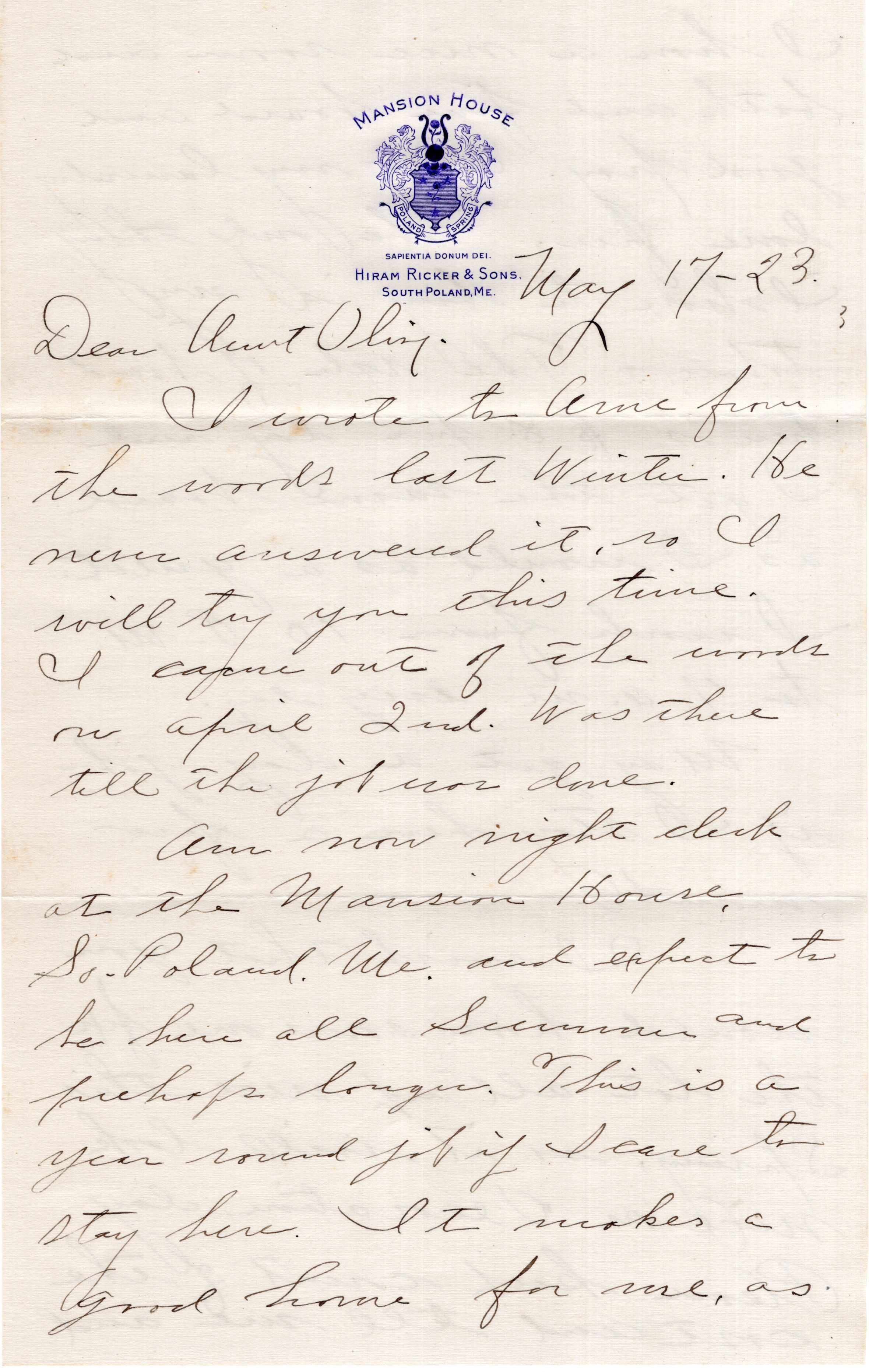 Knight Collection - 1923 Letter; Dated May 17; Written by Herbert Dyer to his aunt Olive Knight; he is the son of Fred and Emma Dyer, Olive's sister.Relationships