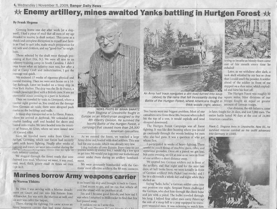 Frank Slegona's WW II account Bangor Daily News article, Nov. 11, 2009