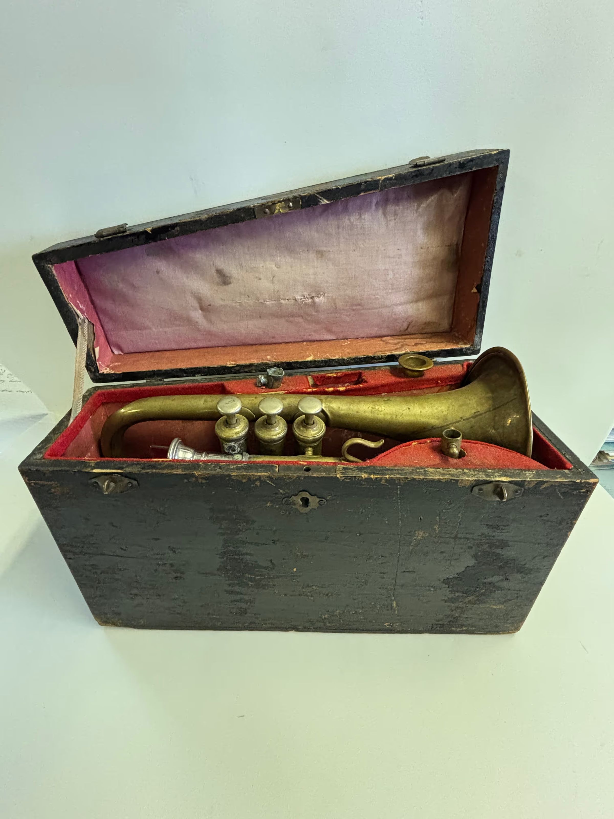 Coronet and Accessories in Case; includes mouthpieces and music stands, along with a Lincolnville Band patchRelationships