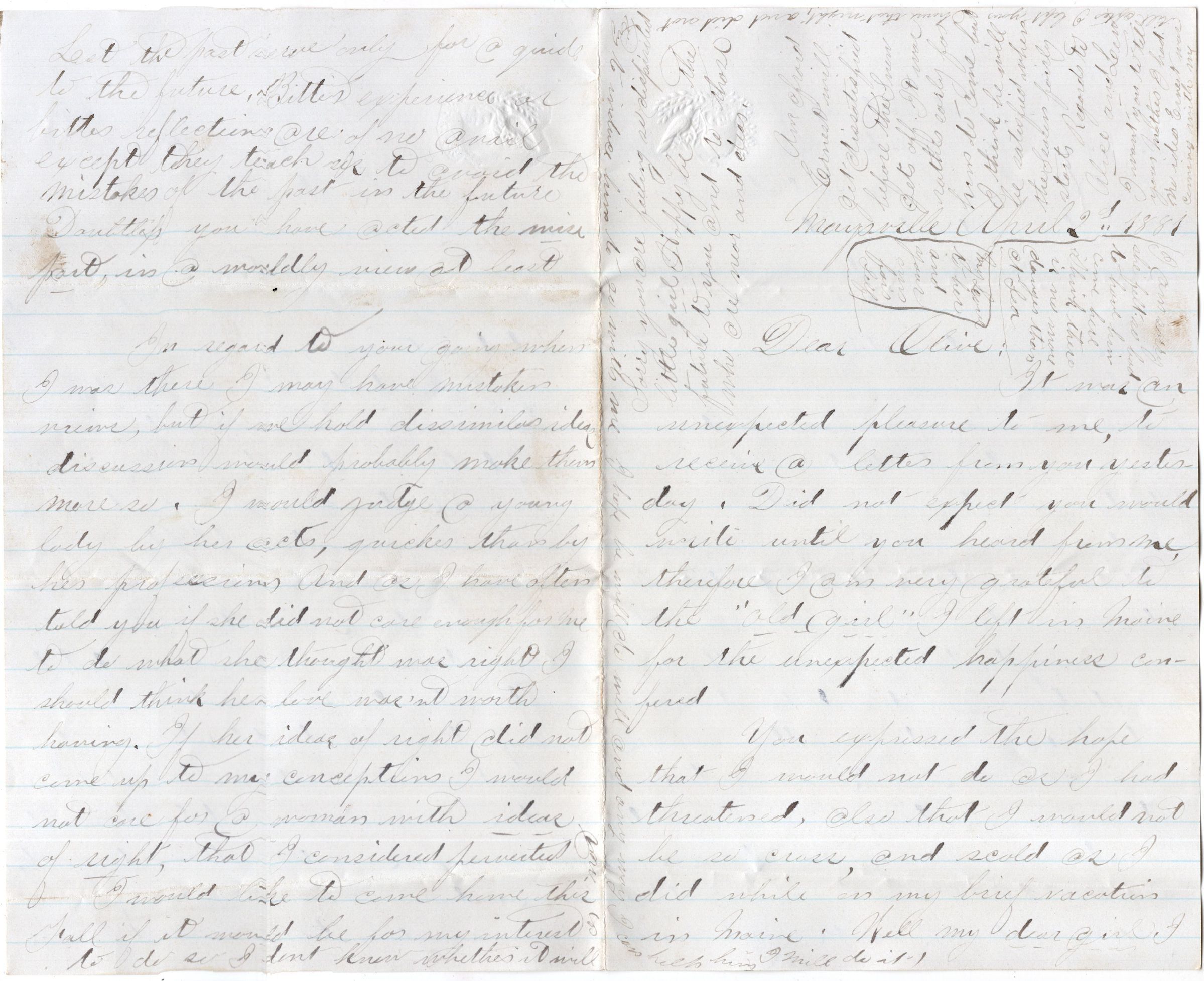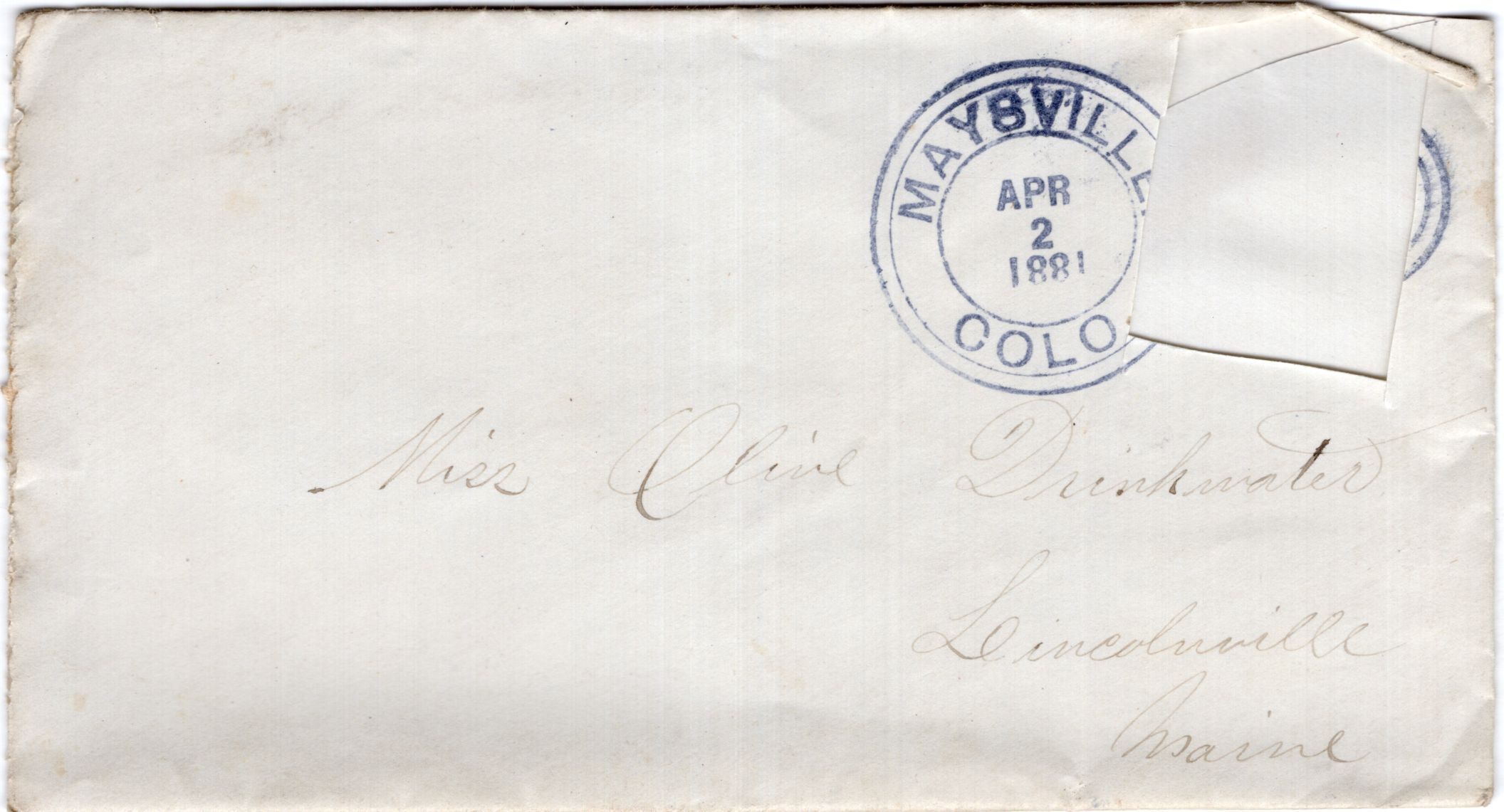 Knight Collection - 1881 Letter; Dated April 2nd; Written by Arno Knight to Olive Drinkwater; Arno is working in ColoradoRelationships