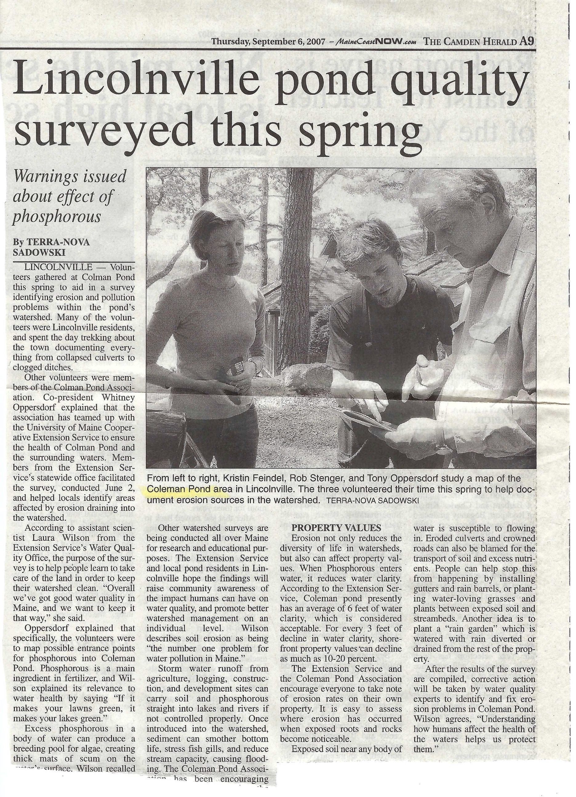 Sept. 6, 2007 Camden Herald article on Coleman Pond water quality