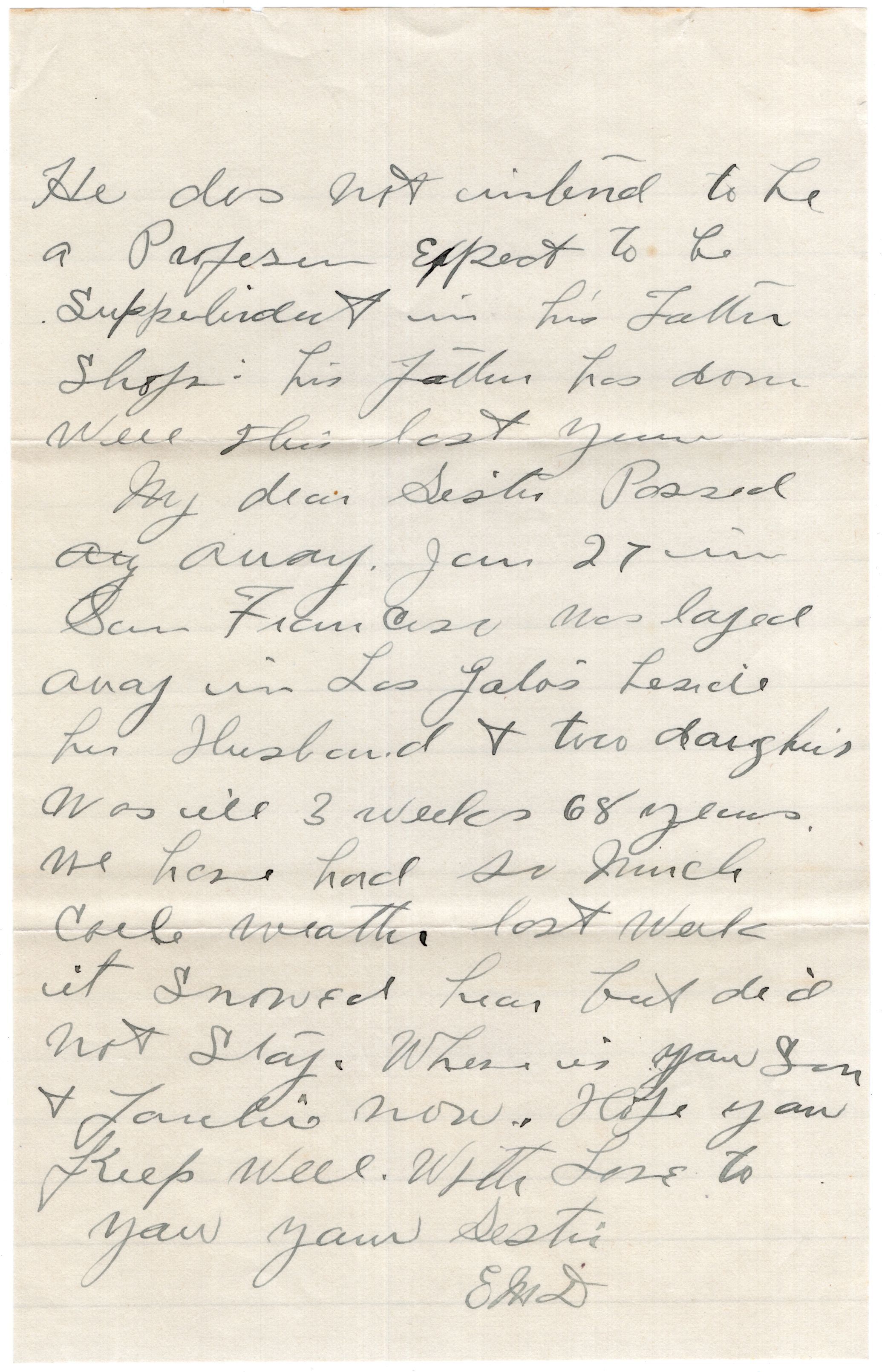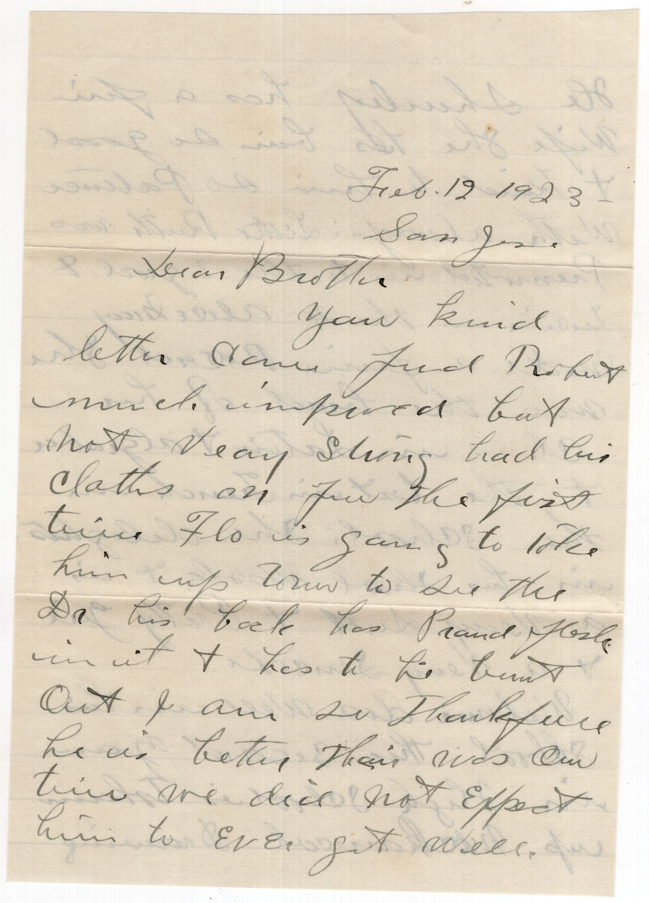 Knight Collection - 1923 Letter; Dated February 12; Written by Emelia Drinkwater to her brother-in-law Arno Knight; Emelia is the wife of Olive's brother Moses Drinkwater, who died in 1890.Relationships