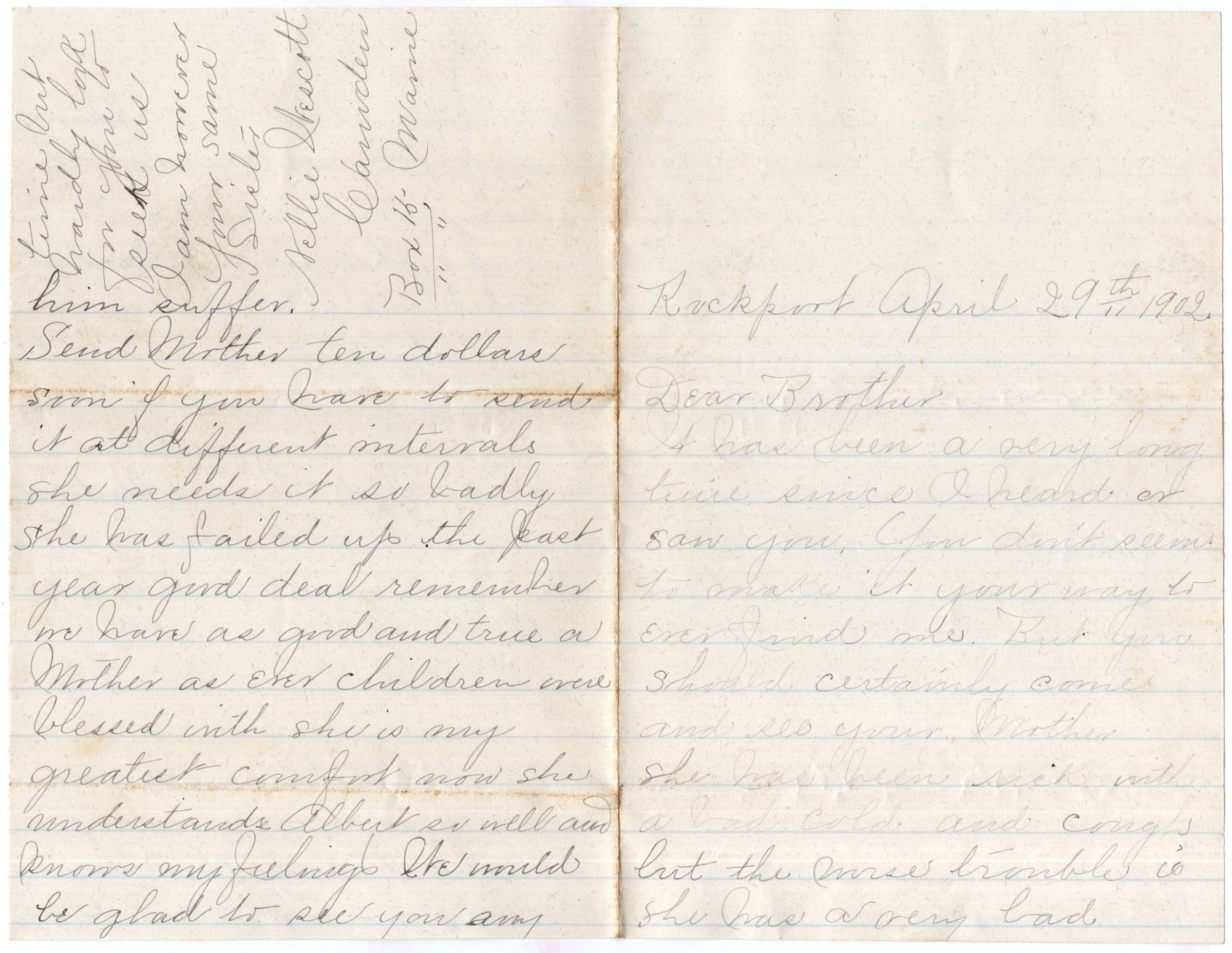 Knight Collection - 1902 Letter; Dated April 29; Written by Nellie Wescott to her brother Arno Knight; Nellie lives with her second husband William Wescott, her son Albert Drinkwater, her mother Delania Knight, and two of Avans Knight's children (Avans' wife Winnie died after childbirth in 1899)Relationships