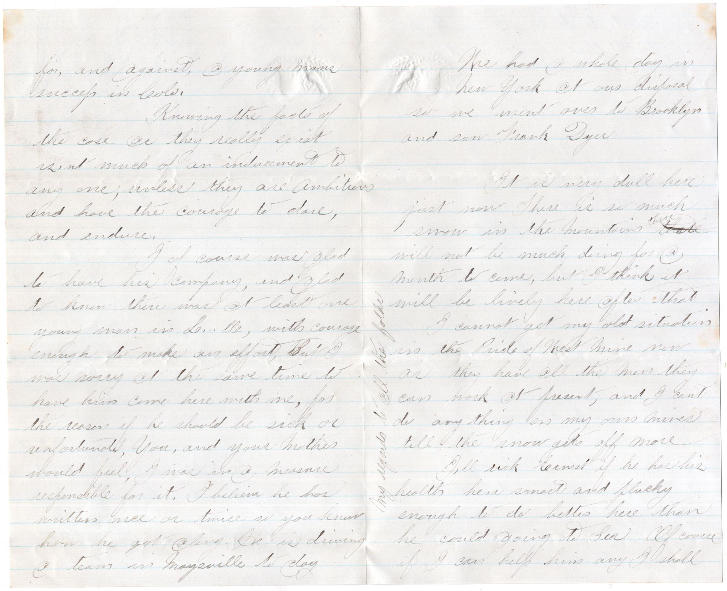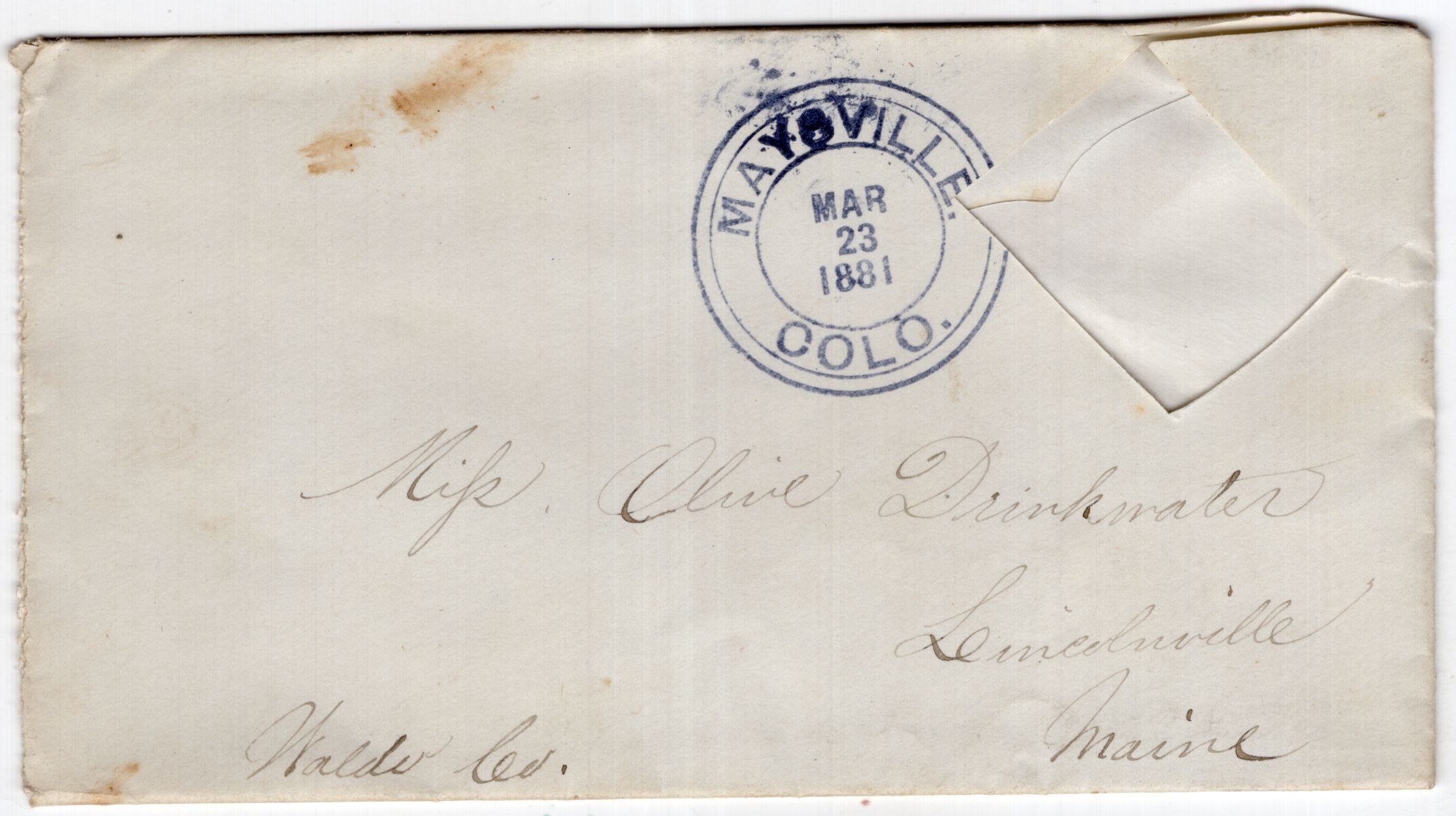 Knight Collection - 1881 Letter; Dated March 23rd; Written by Arno Knight to Olive Drinkwater; Arno has traveled back to Colorado after coming home to tend to his ill father, Rufus Knight; Rufus died on February 4thRelationships