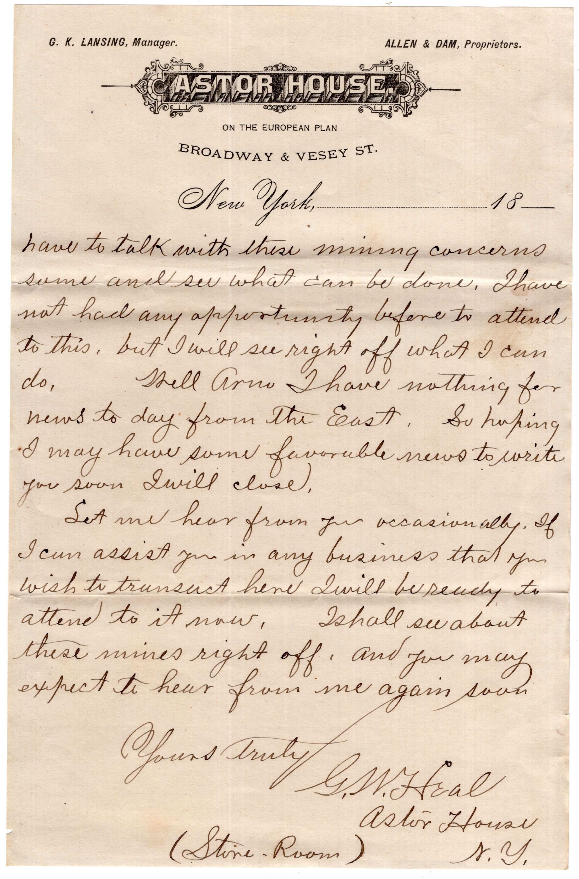 Knight Collection - 1881 Letter; Dated May 8th; Written by G.W. Heal in New York to Arno Knight in ColoradoRelationships