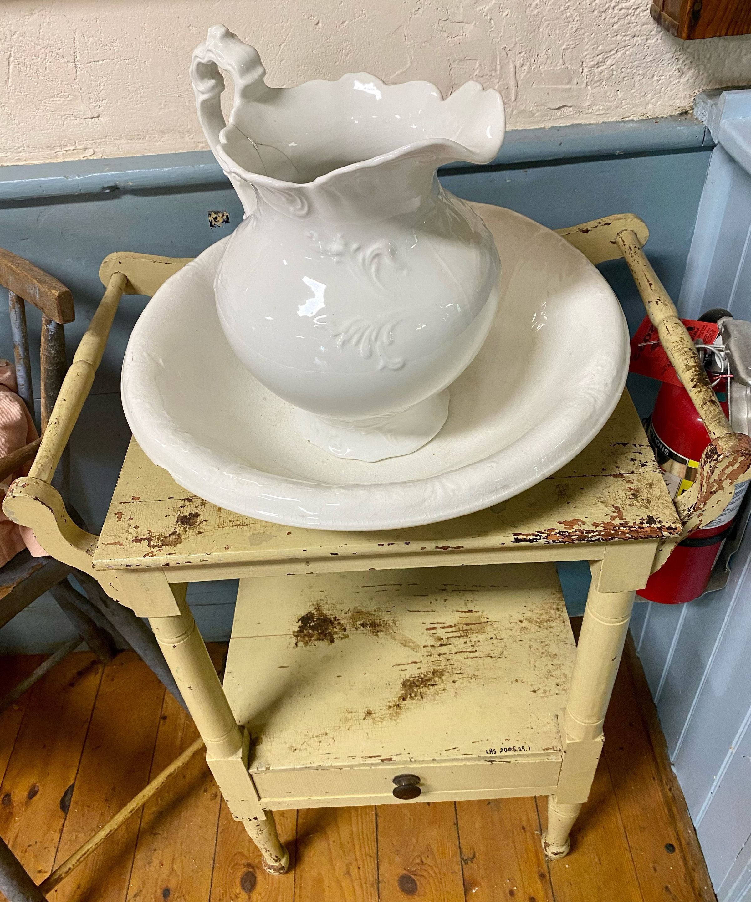 Wood stand with hole for wash set; 2 rungs for wash cloth and/or towels; small shelf with drawer near bottom
