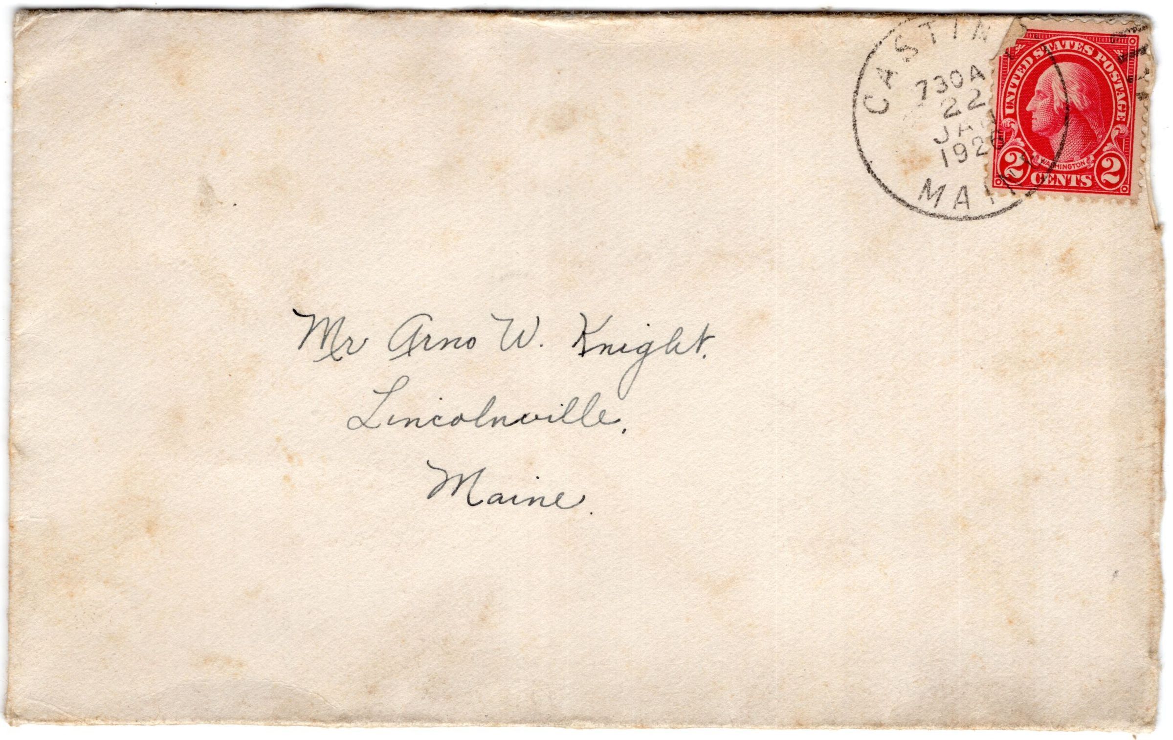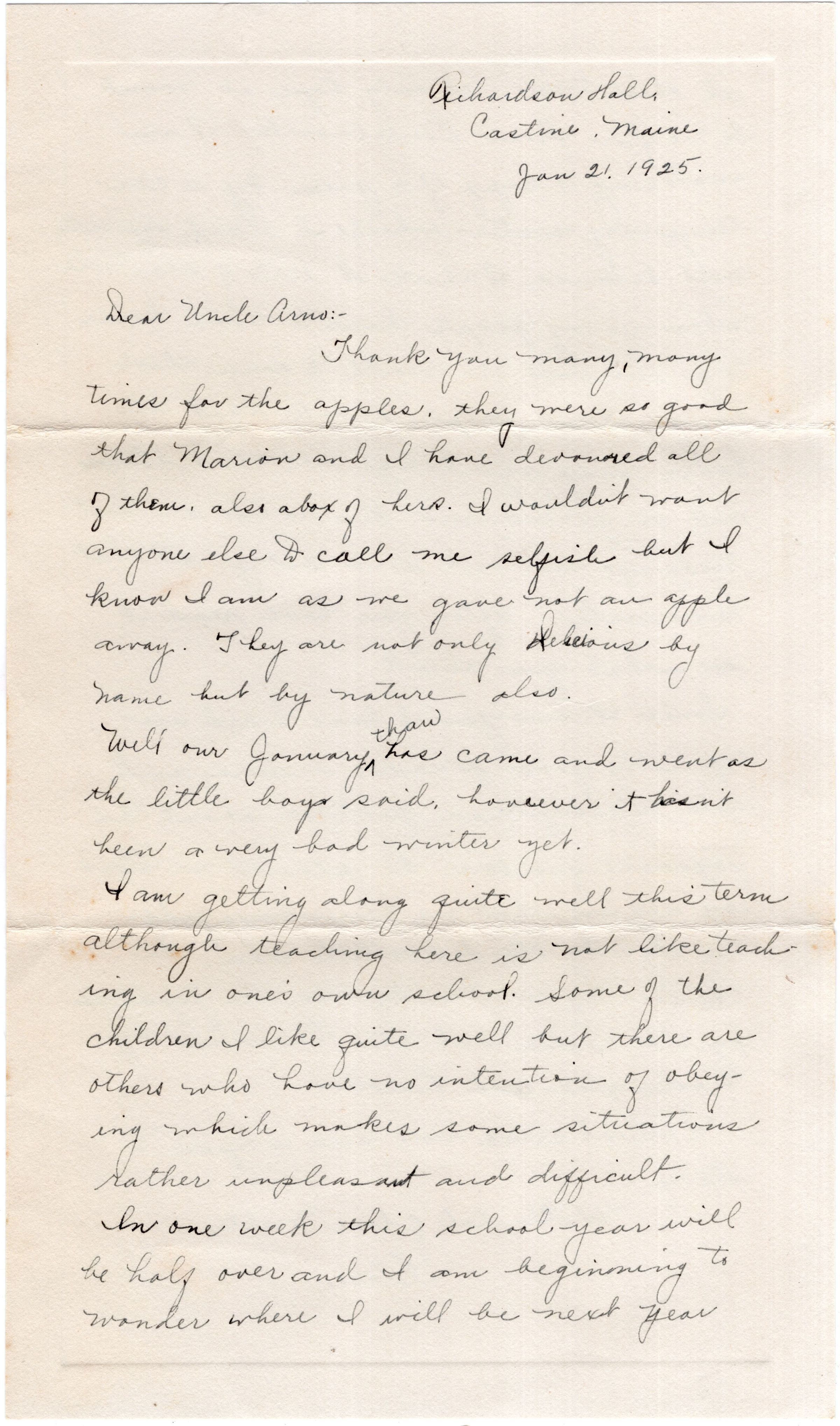 Knight Collection - 1925 Letter; Dated January 2; Written by Flora Young to Arno Knight; Flora is the daughter of Parker and Myra Young, who are neighbors of Arno, but not related; Marion is her sister.Relationships