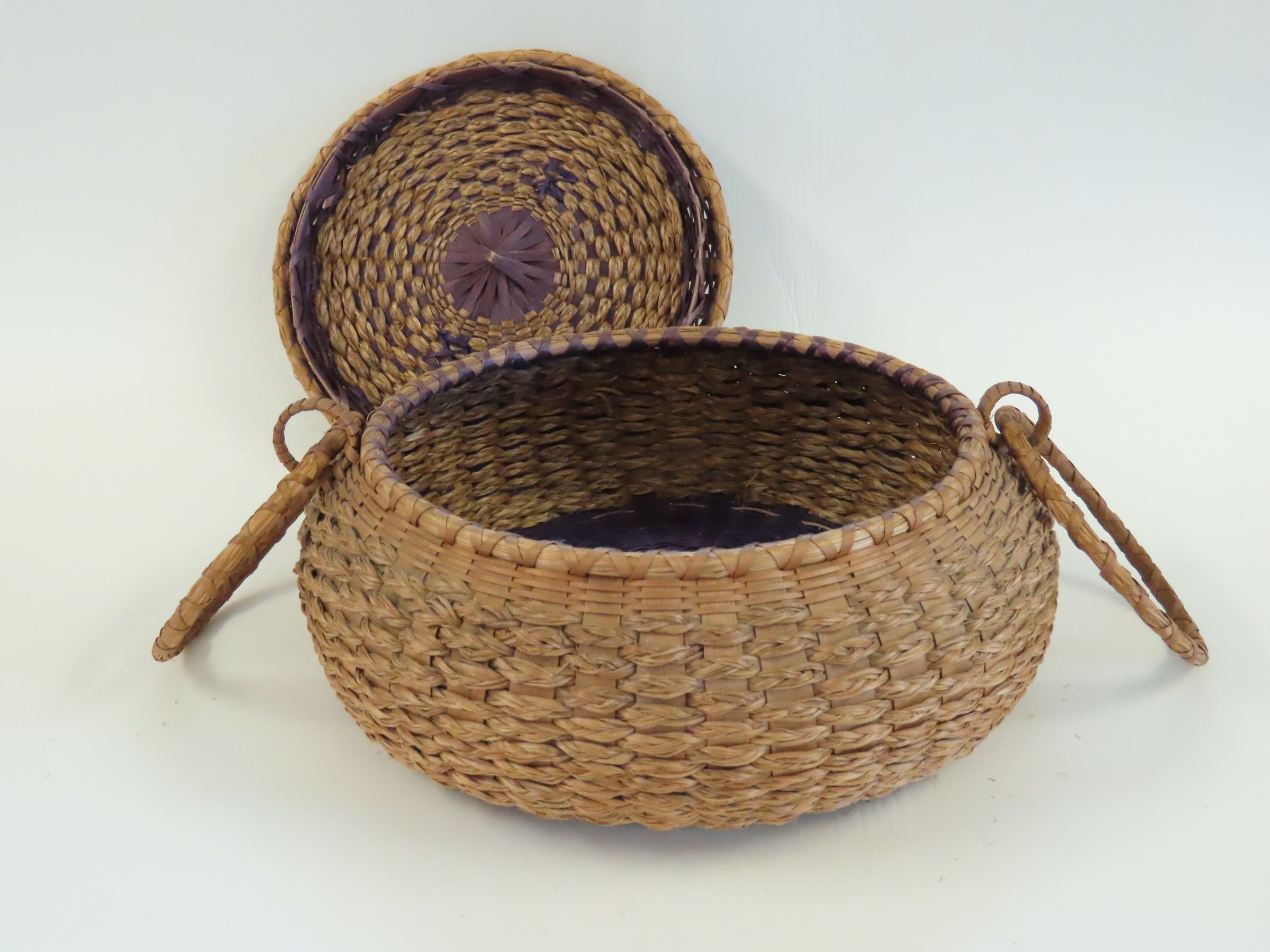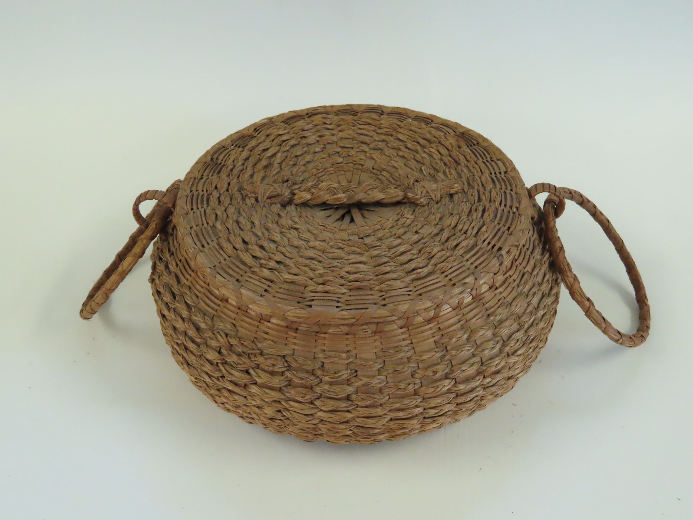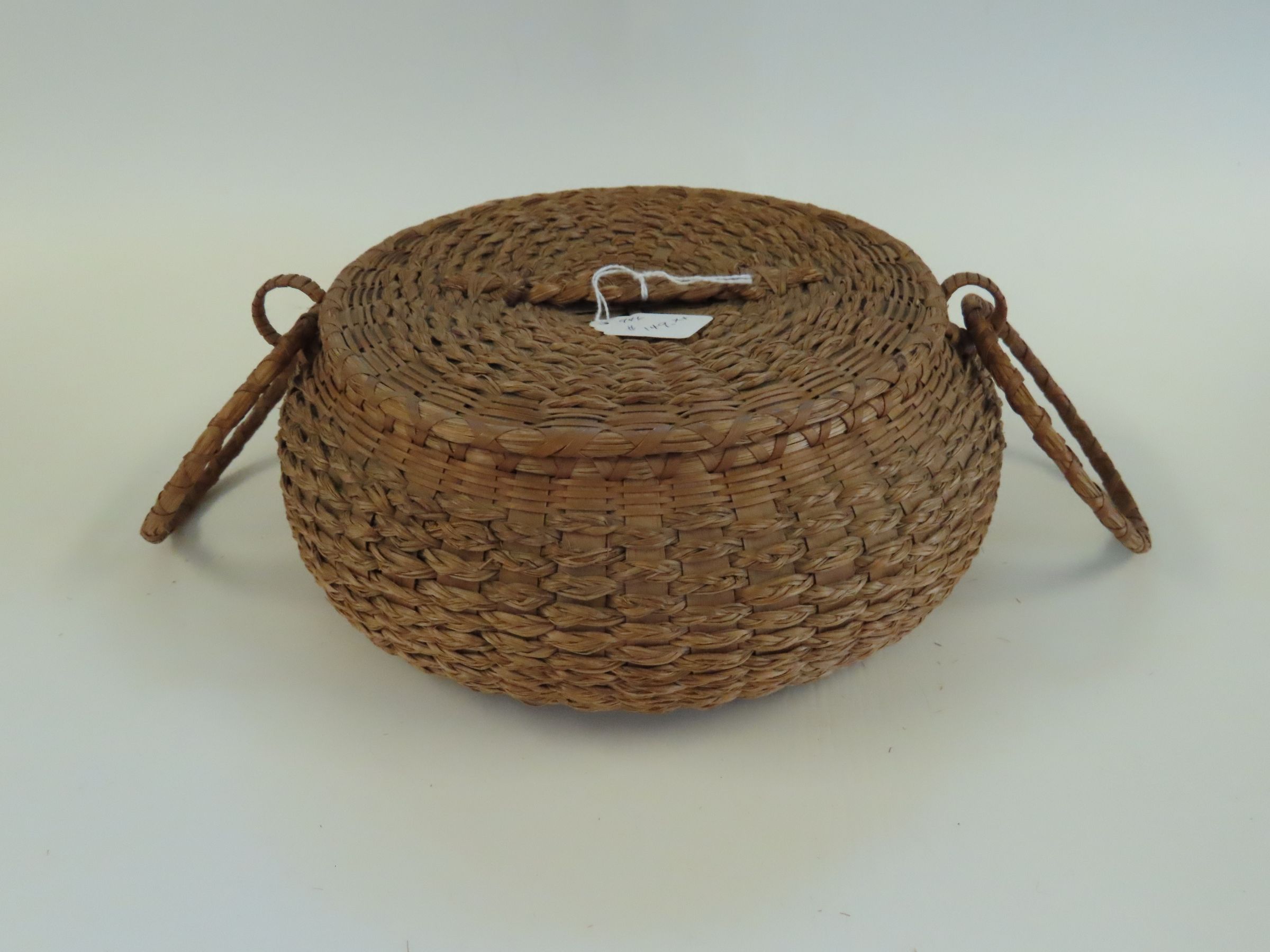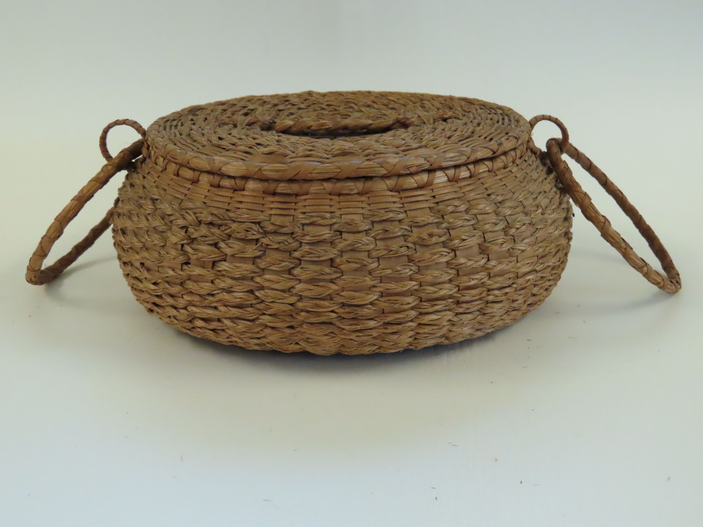Round Woven Basket with Lid and Two Large Ring Handles. Made of Brown Ash and Sweetgrass, circa 1930
