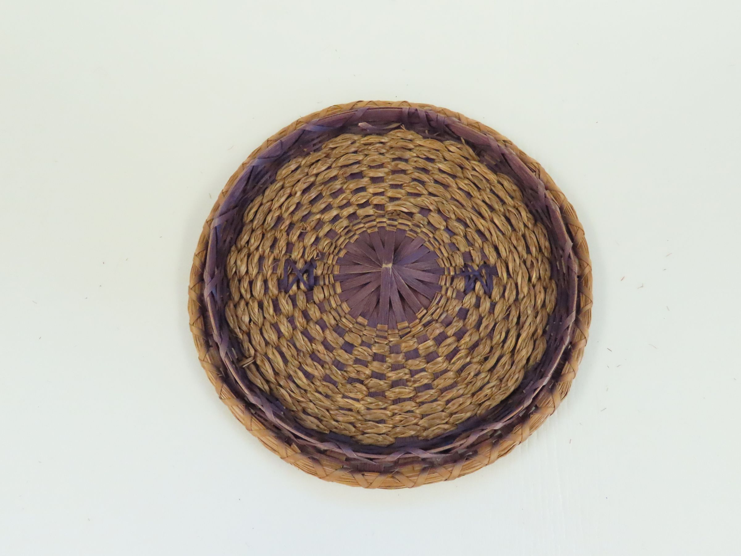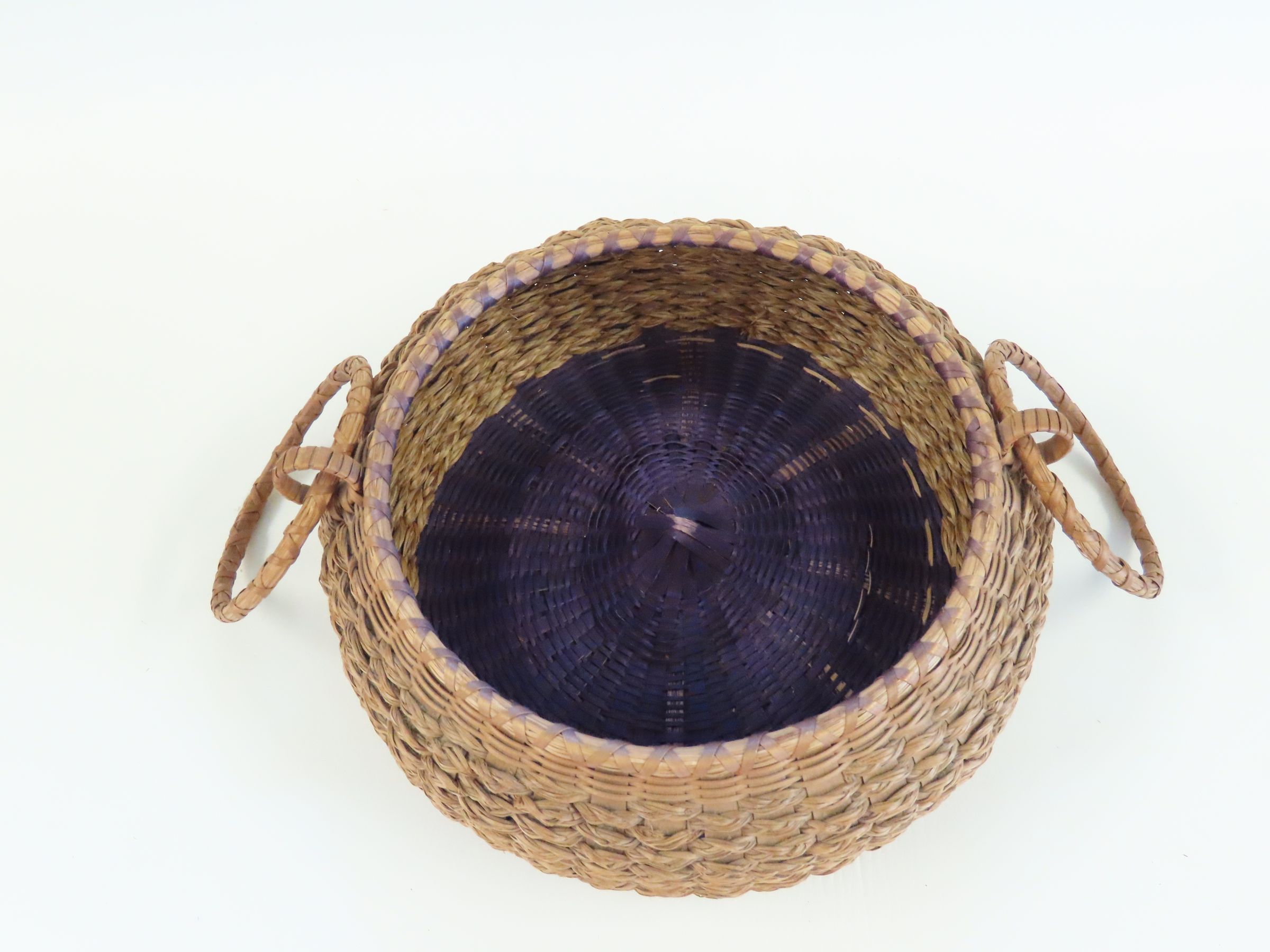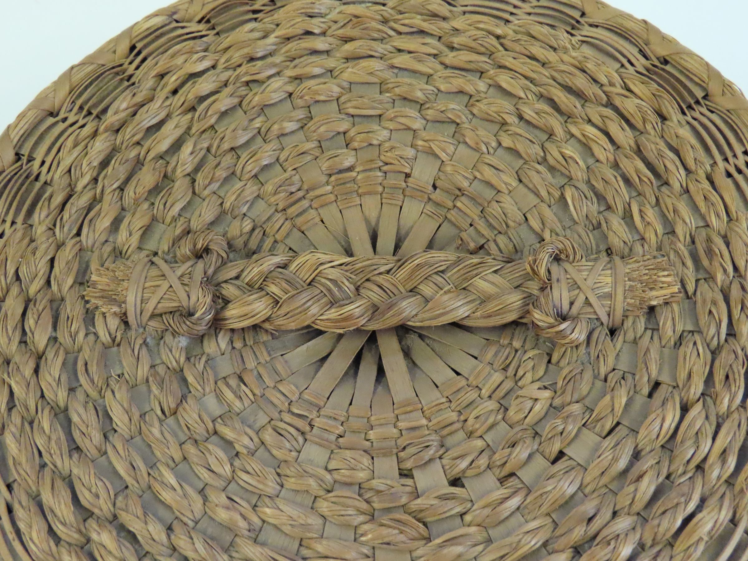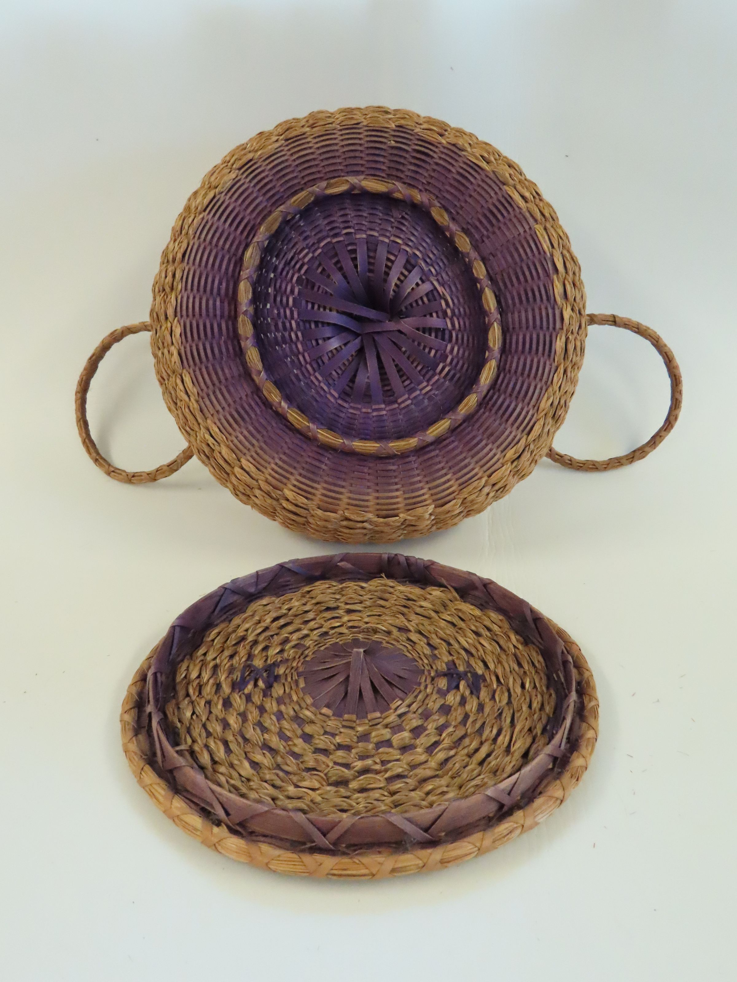 Round Woven Basket with Lid and Two Large Ring Handles. Made of Brown Ash and Sweetgrass, circa 1930