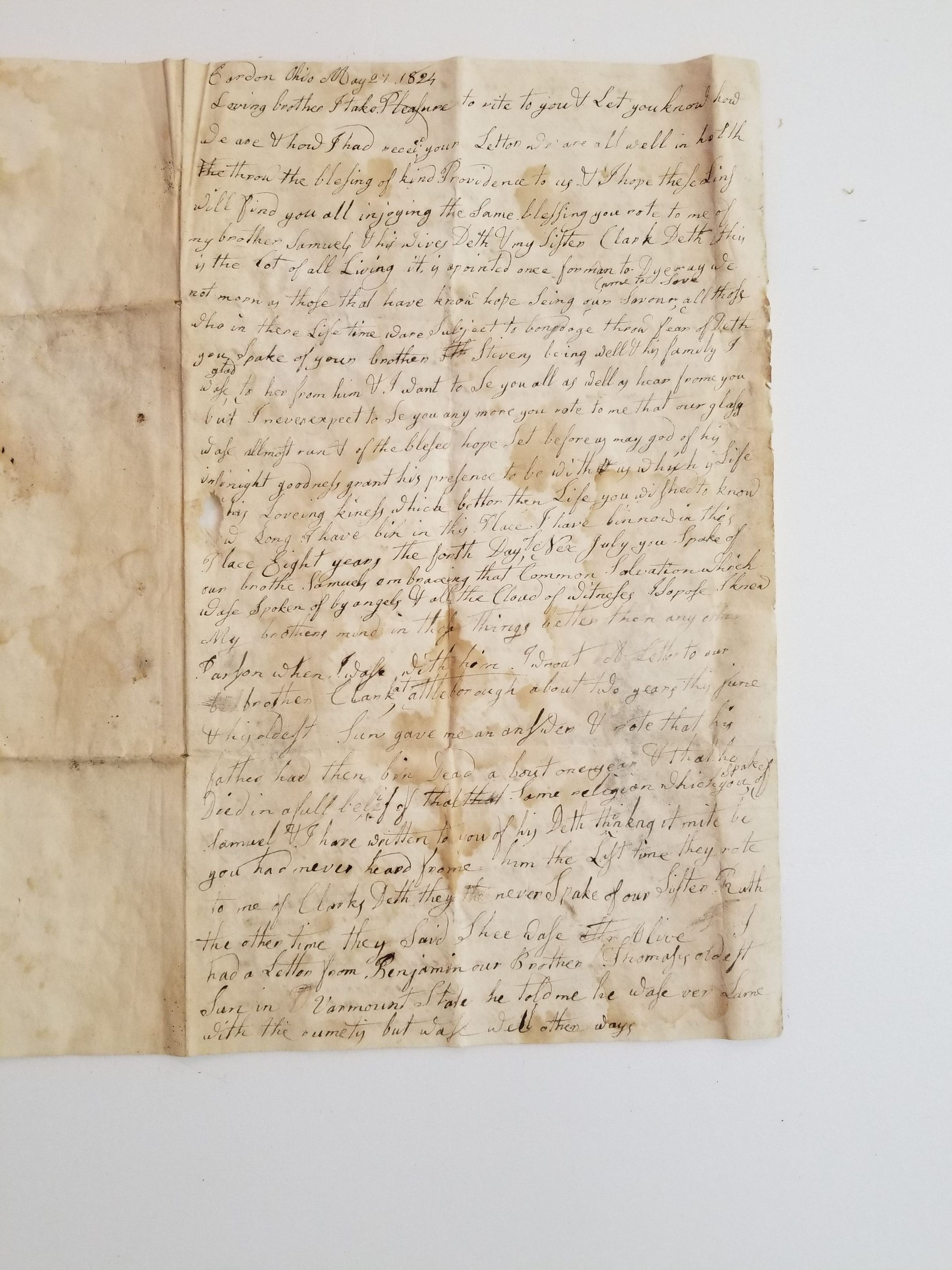 Knight Collection - Letter 1824; Dated May 27th; Written by David Sweetland to his brother Samson Sweetland; they are brothers of Lydia Knight who is Arno Knight's mother