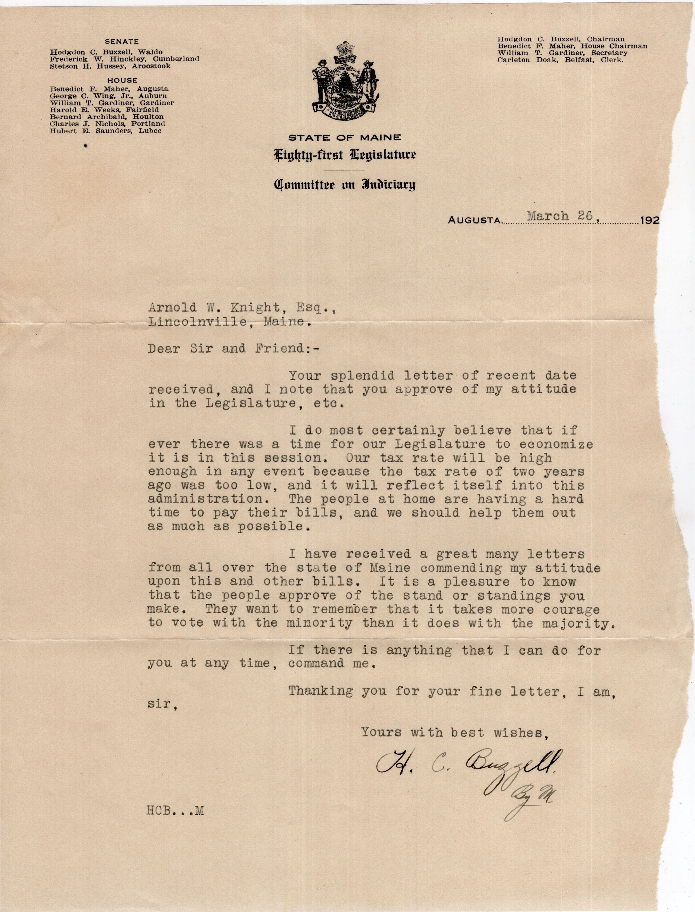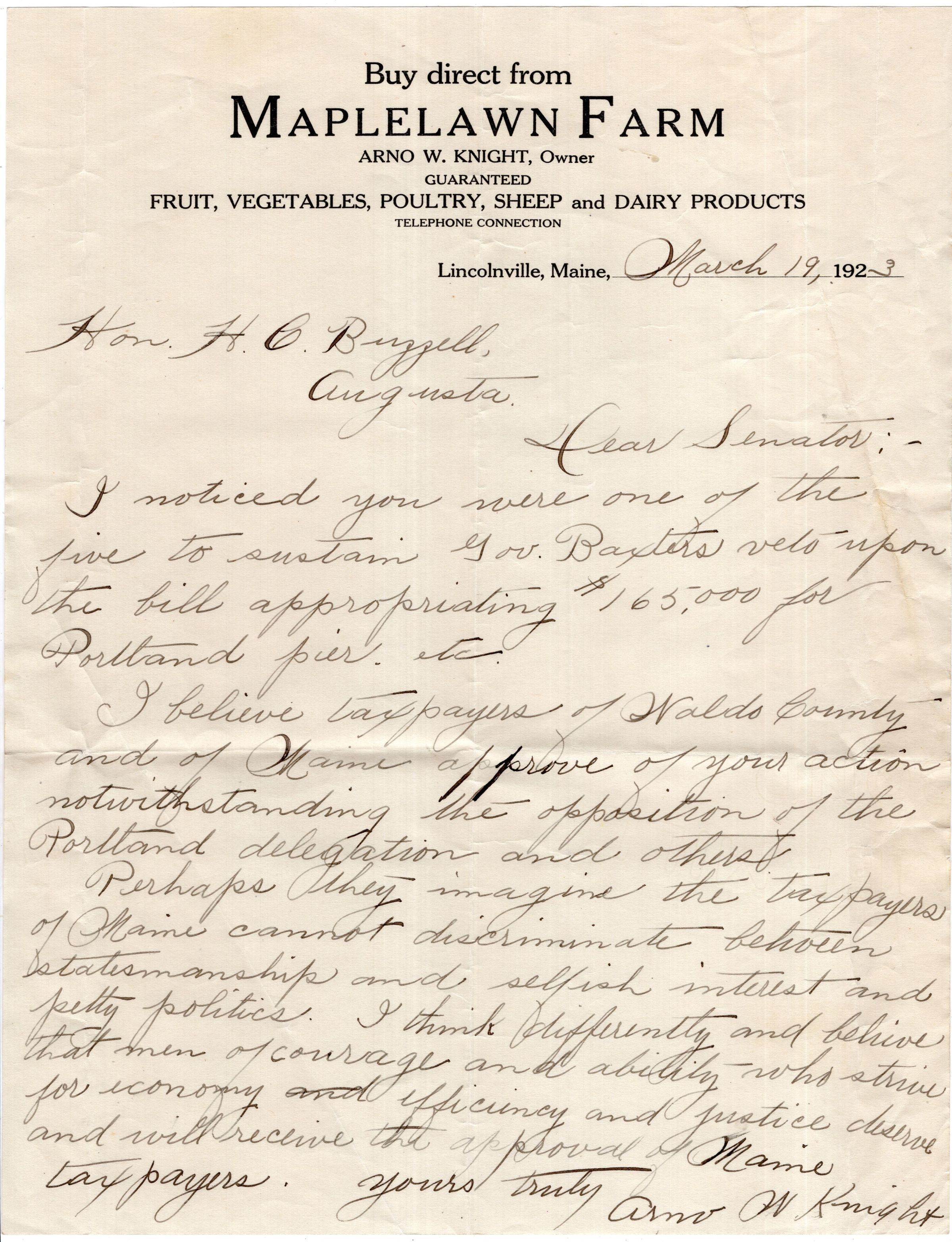Knight Collection - 1923 Letter; Dated March 19; Written by Arno Knight to Senator H.C. Buzzell; includes typed response from Buzzell.Relationships