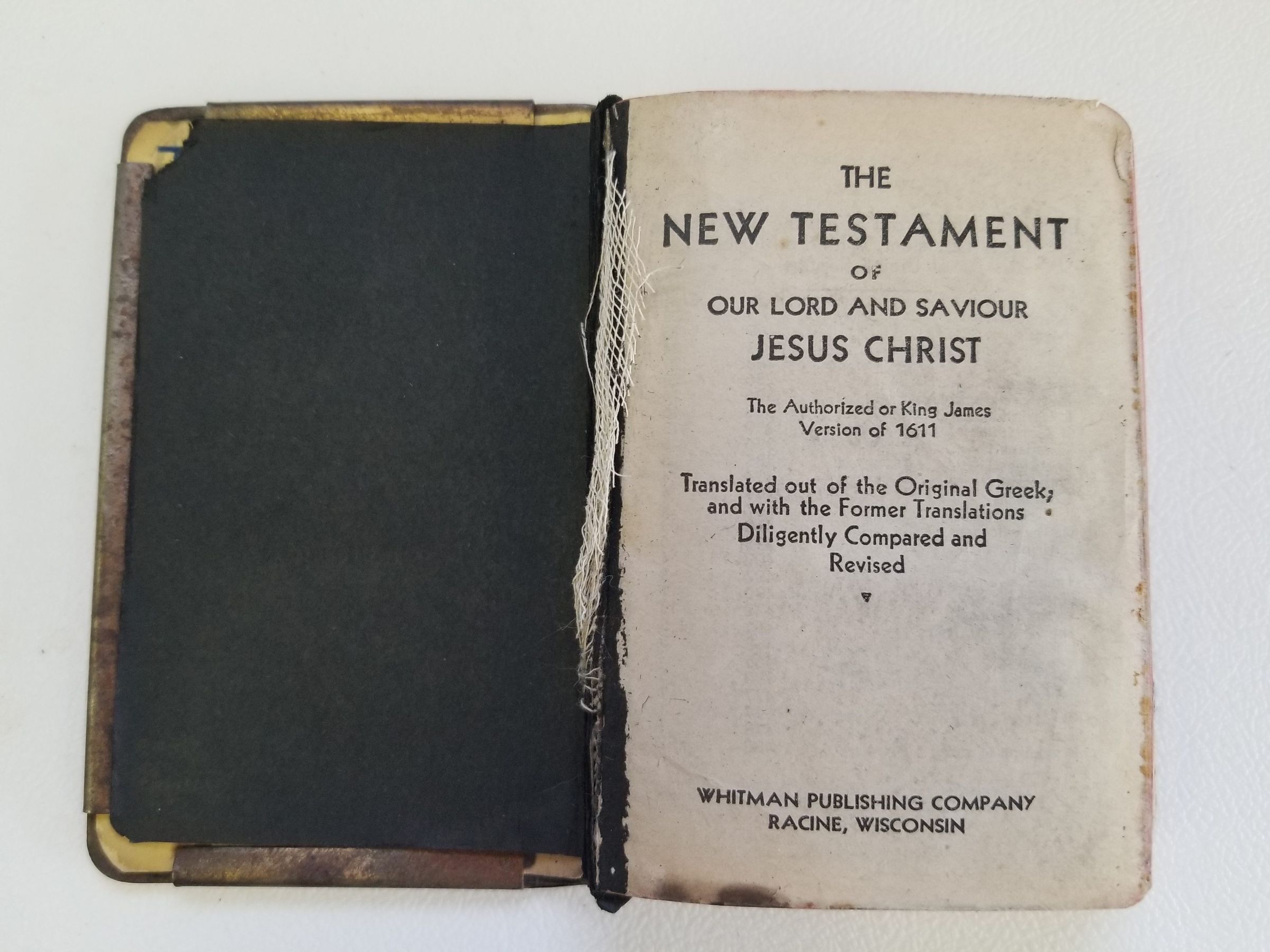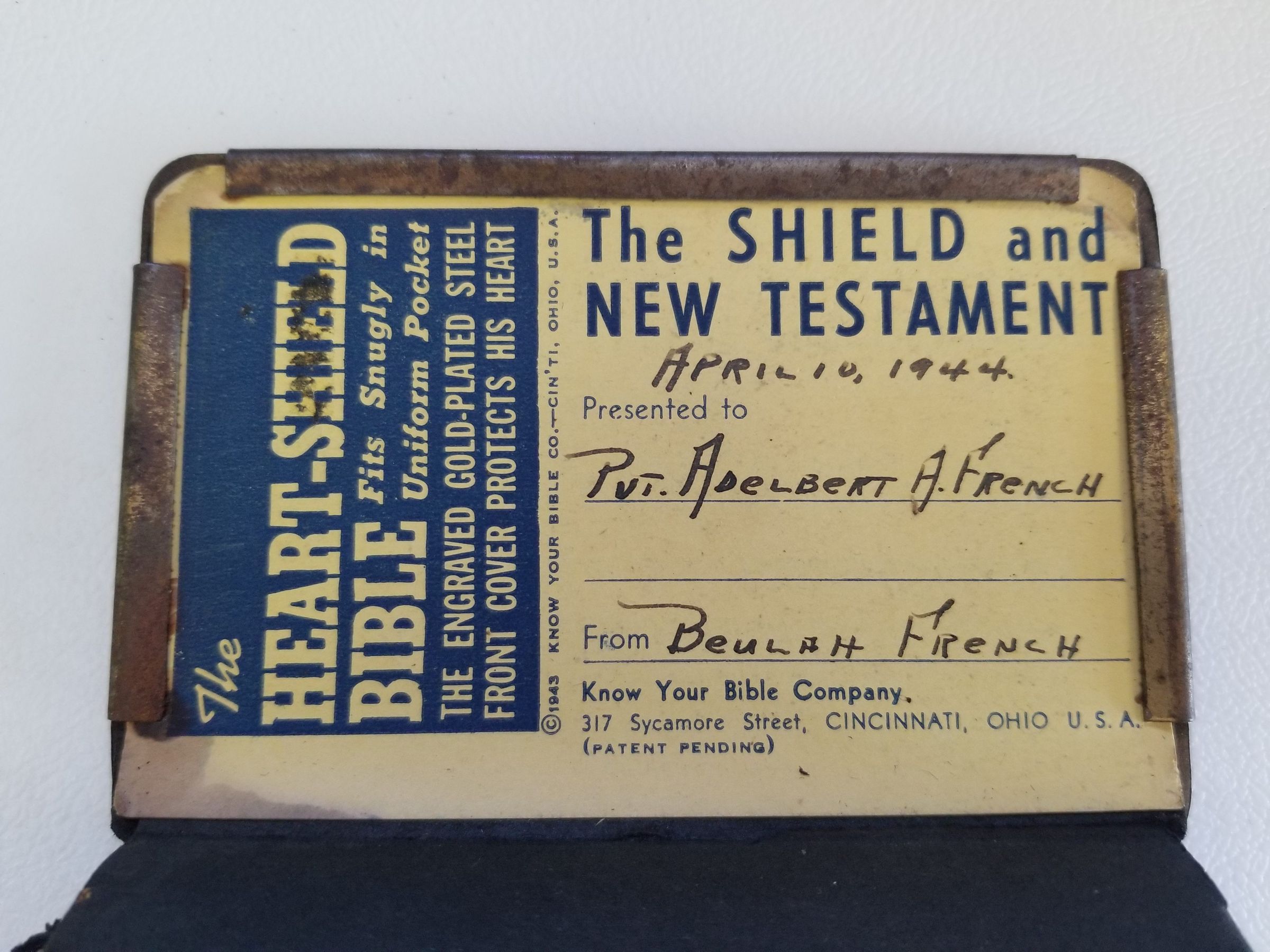 Heart Shield Bible belonging to Adelbert French 1944; Given to him by Beulah French; Front engraving reads "May this Keep you from Harm"; New TestamentRelationships