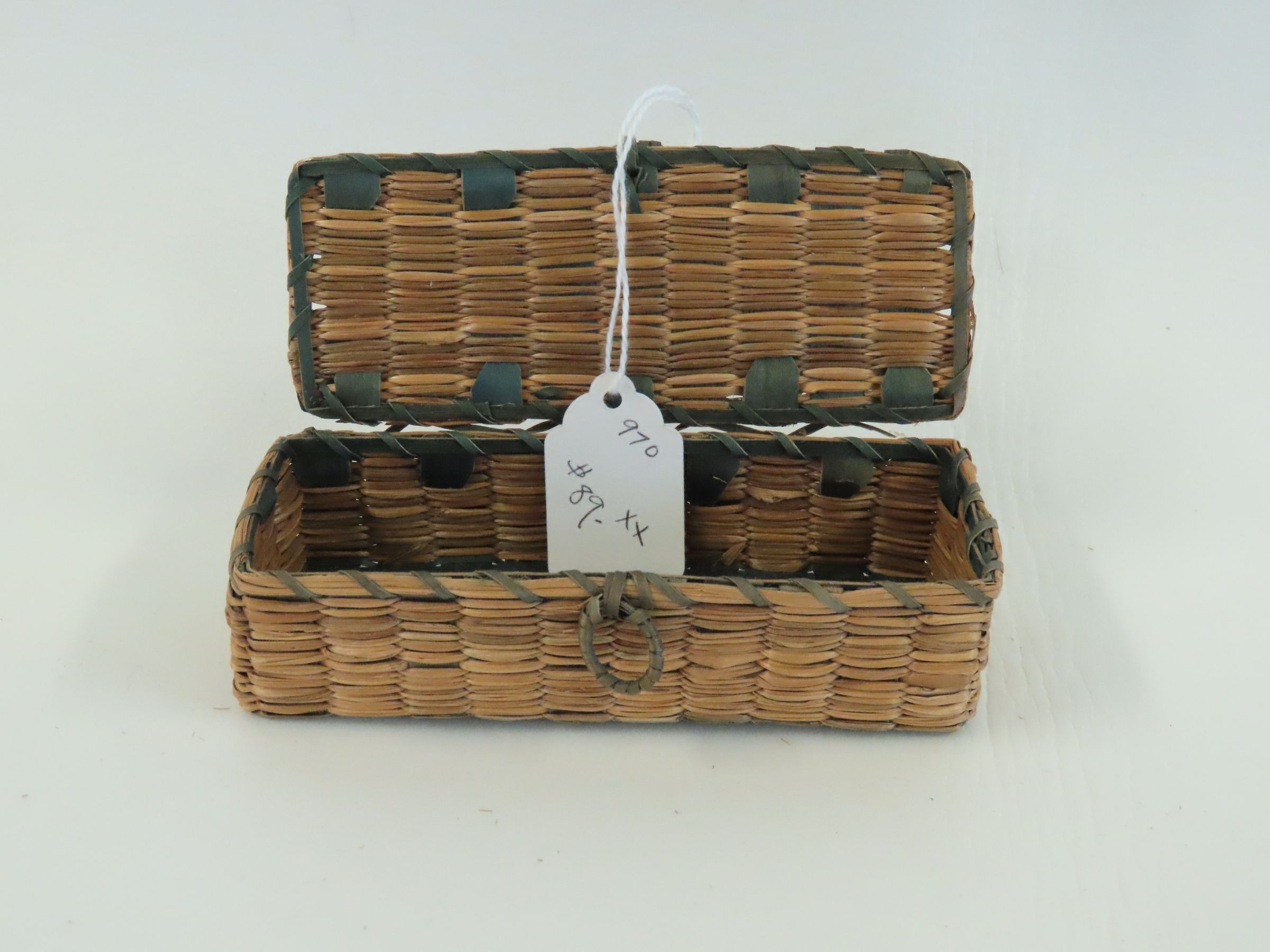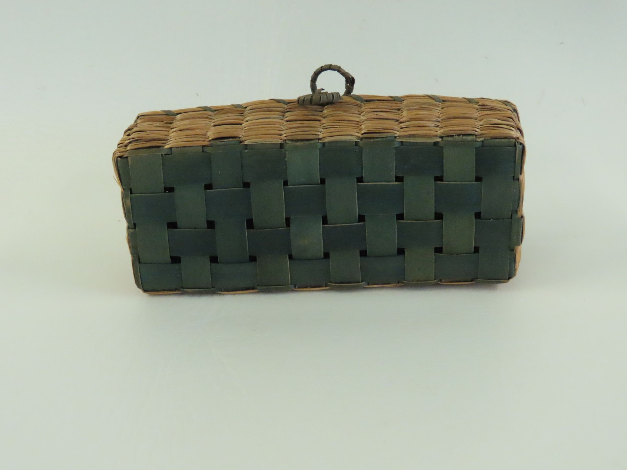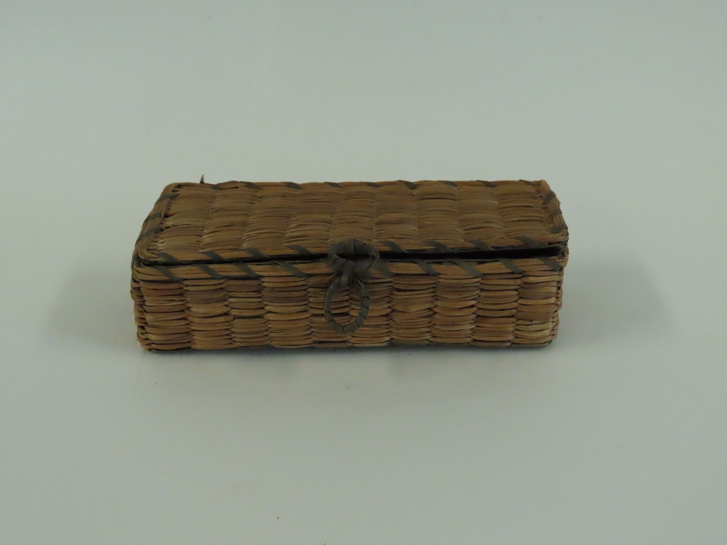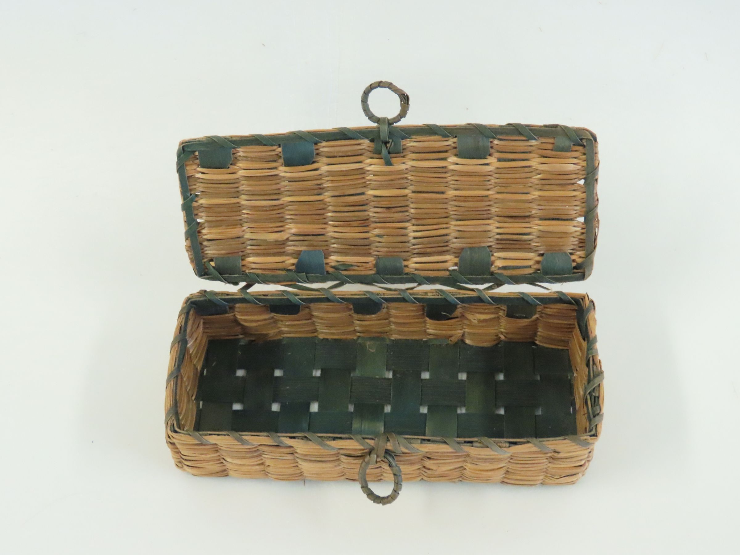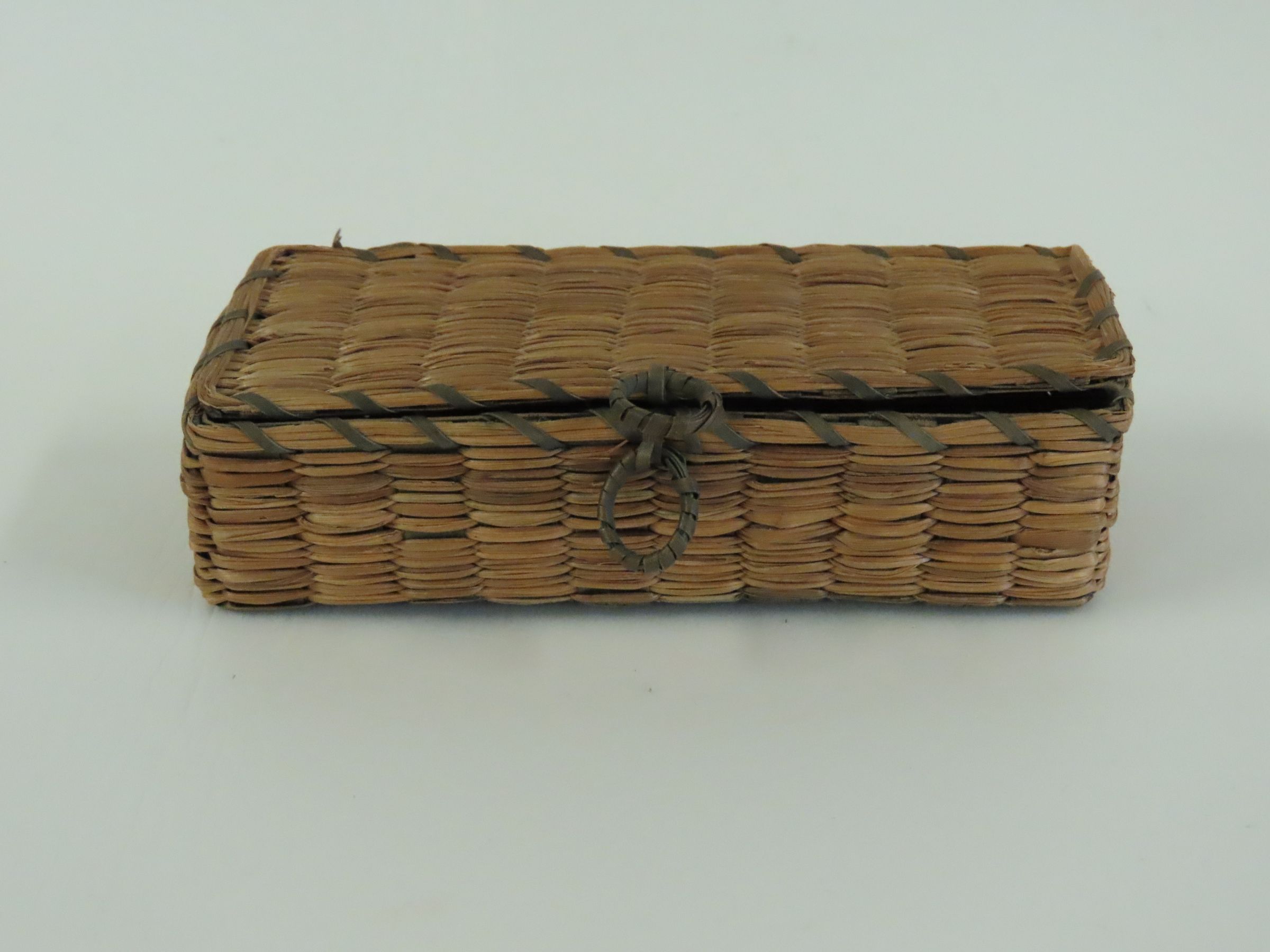 Small Rectangular Woven Box with Attached Lid and Small Ring Pulls. Made of Brown Ash and Sweetgrass, circa 1930
