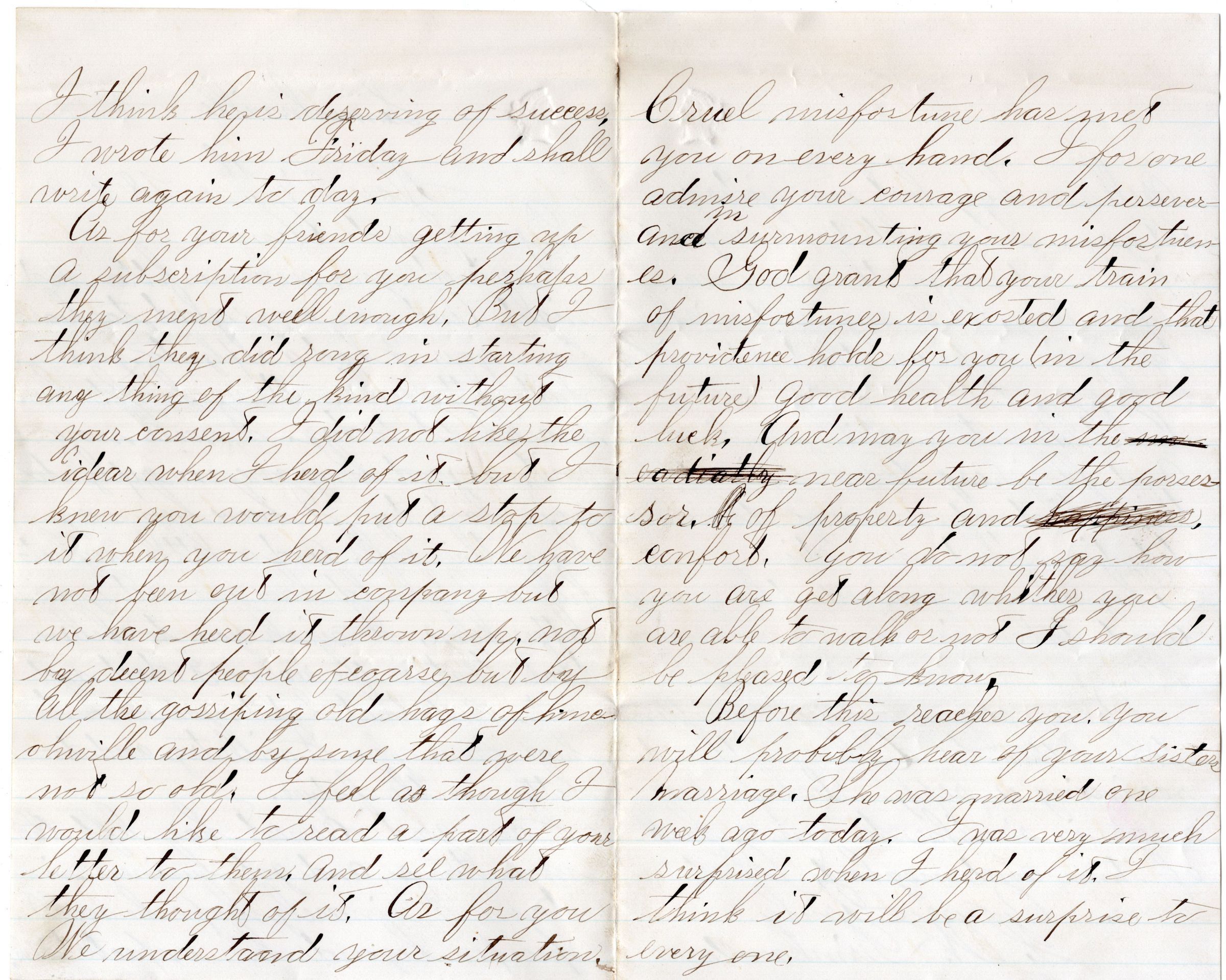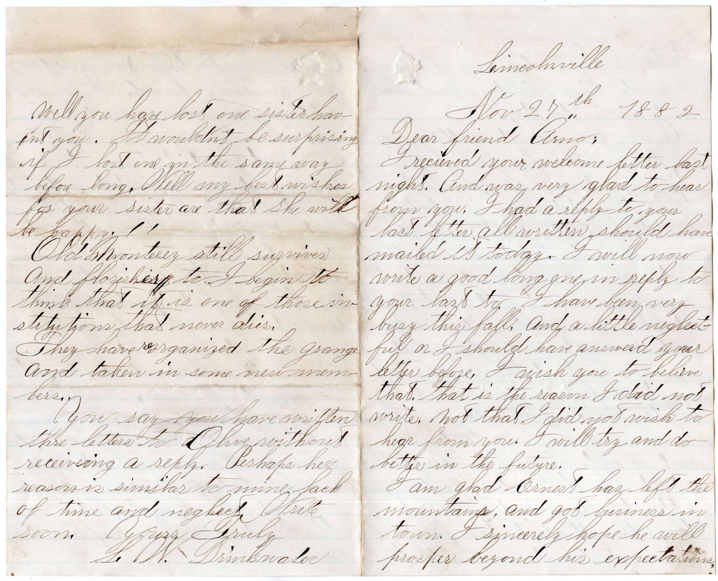 Knight Collection - 1881 Letter; Dated November 27th; Written by Llewellyn Drinkwater (Olive's youngest brother) to Arno Knight; Arno is working in Colorado and is recovering from having his leg broken badly in a mine explosionRelationships
