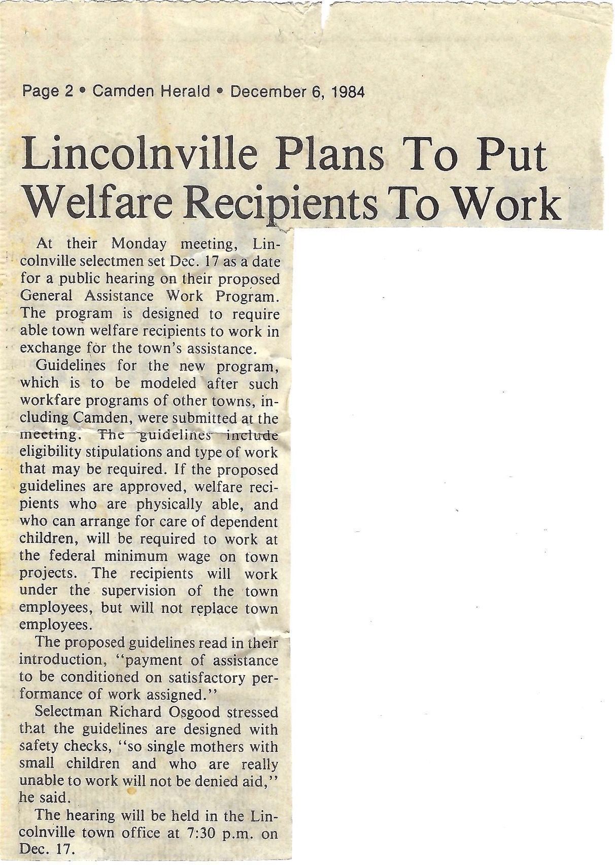 Dec. 6, 1984 article on hearing on proposed General Assistance Work Program