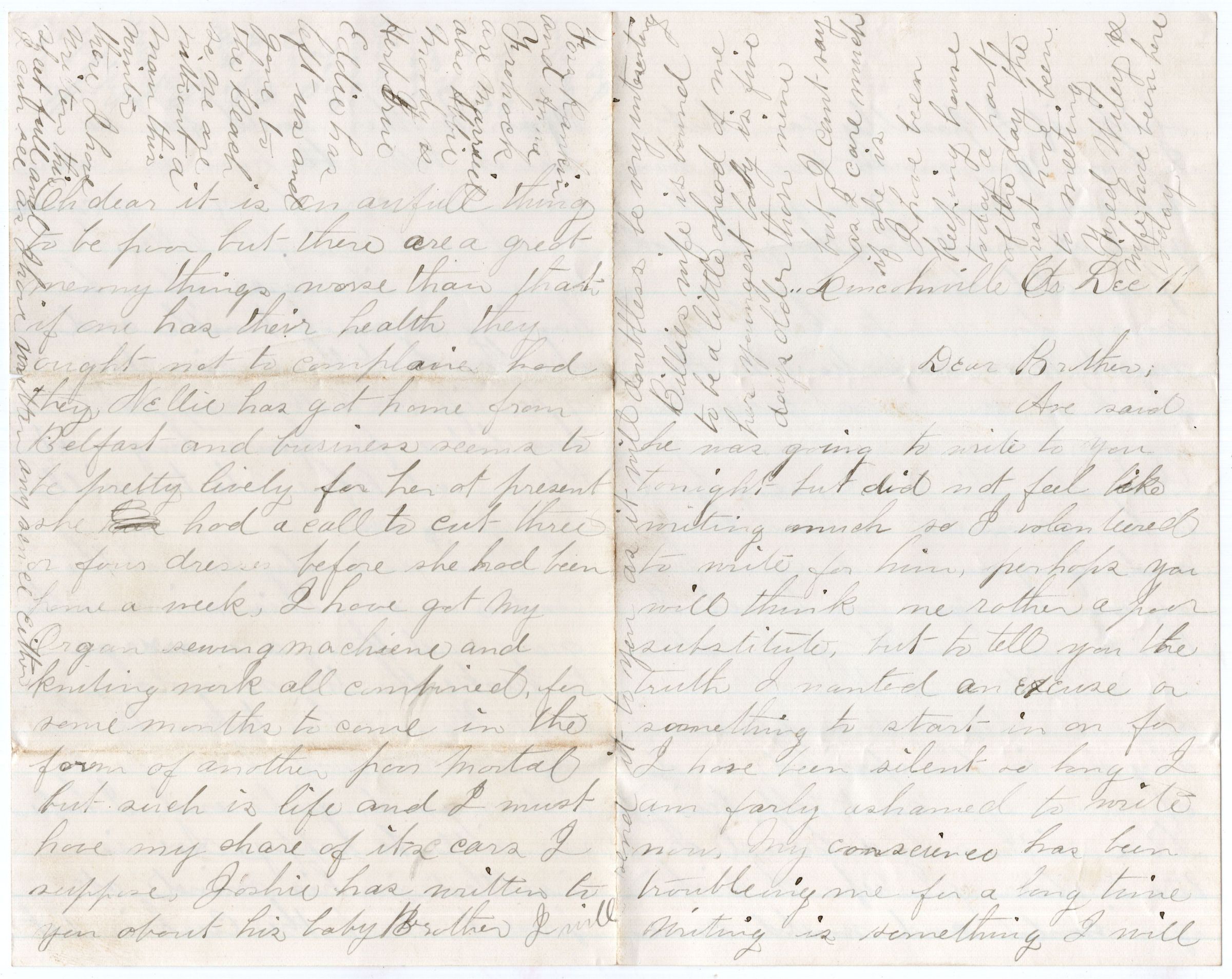 Knight Collection - 1881 Letter; Dated December 11th; Written by Winnie (Tolman) Knight to her brother-in-law Arno Knight; Winnie is married to Avans (Ave) Knight