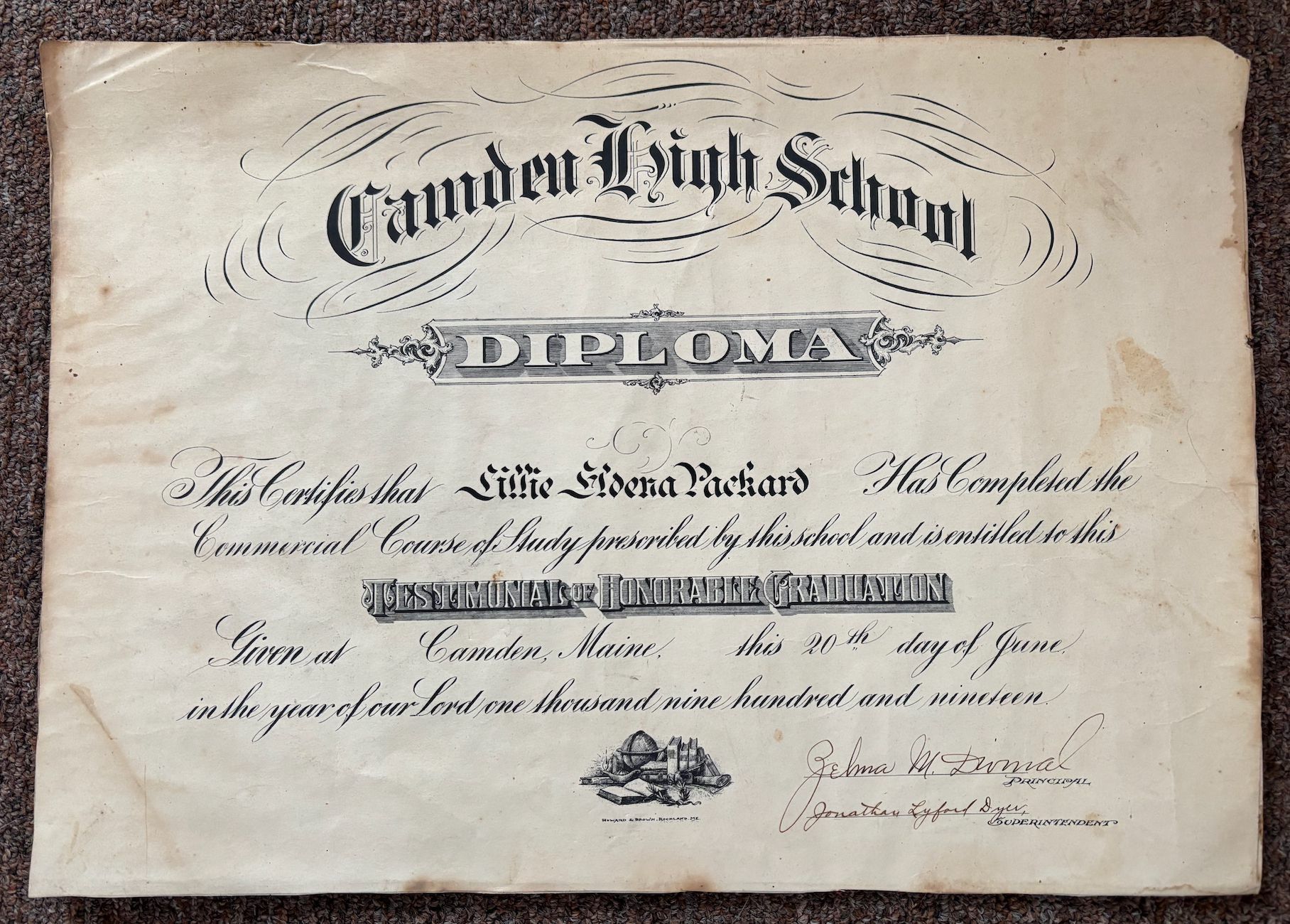Diploma from Camden High School to Lillie Eldena Packard 1919Relationships