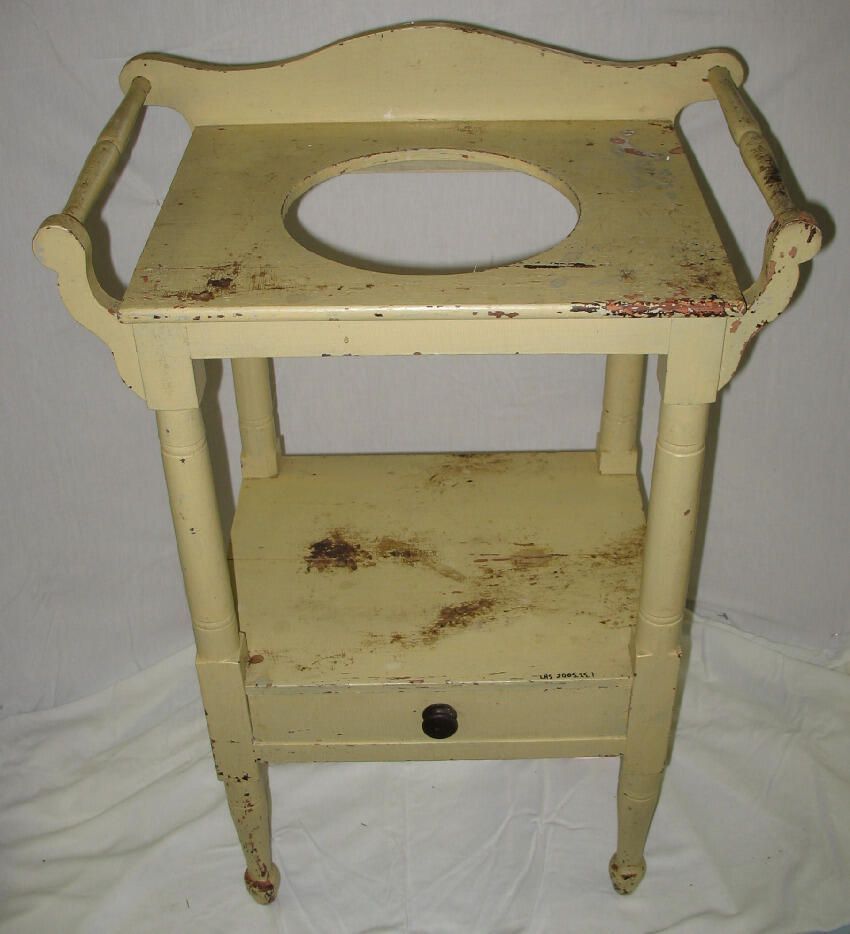 Painted wooden washstand with two towel racks, hole for bowl and one lower shelf
