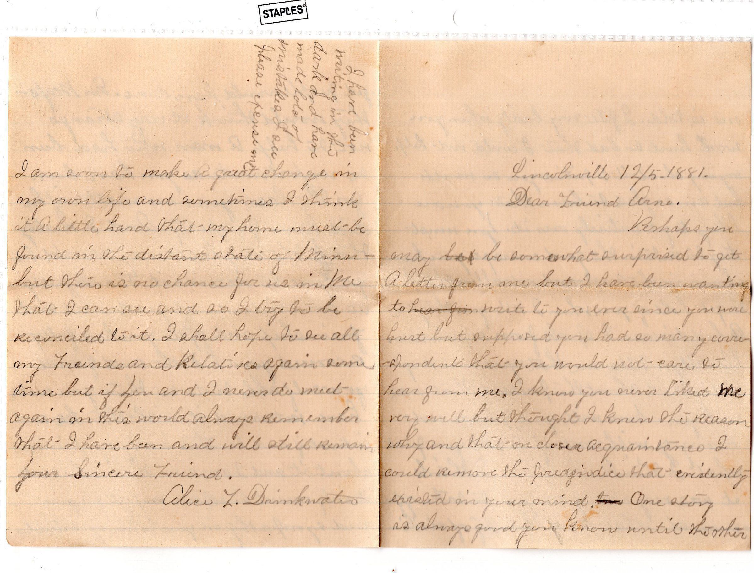 Knight Collection - 1881 Letter; Dated December 5th; Written by Alice Drinkwater (Olive's sister) to Arno Knight; Arno is working in Colorado and is recovering from having his leg broken badly in a mine explosionRelationships