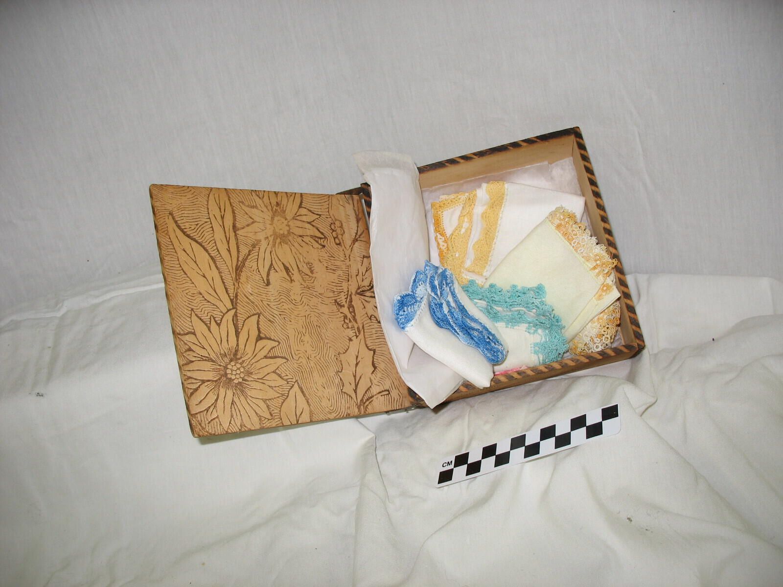 Wood burned decorative handkerchief box containing 6 handkerchiefs with tatted or crocheted edges.Relationships