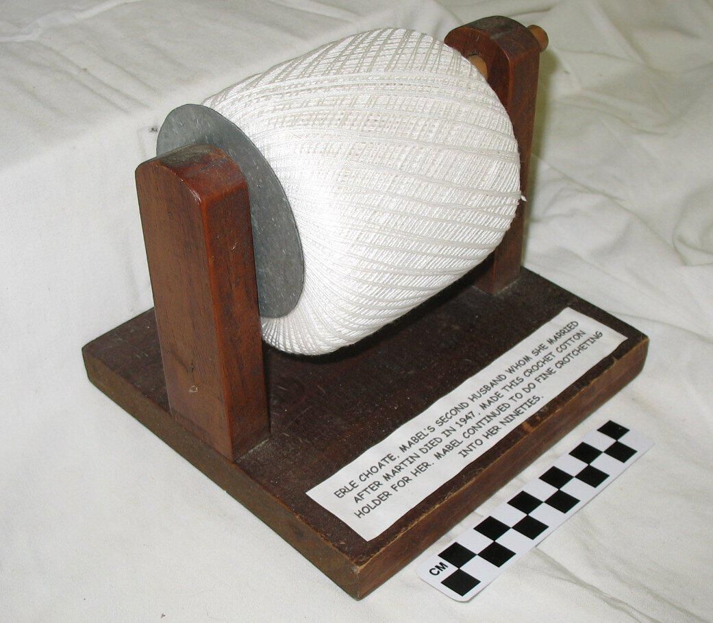 Wooden crochet cotton ball holder, made for Mabel Athearn Choate by her second husband, Erle Choate. Mabel continued to do fine crocheting into her nineties