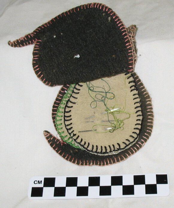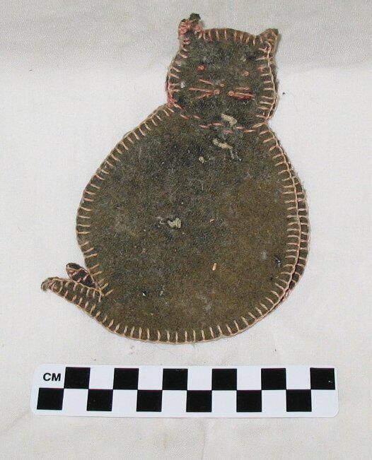 handmade flannel needle case in the shape of a cat, 3 flannel "leaves" inside outlined with buttonhole stitch, some needles