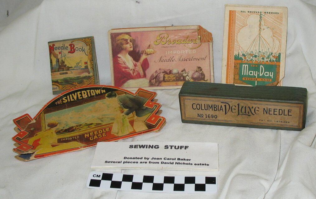 Columbia Deluxe Needle box containing a rug hook and three sizes of punch needles that fit over it four different commercial needle books