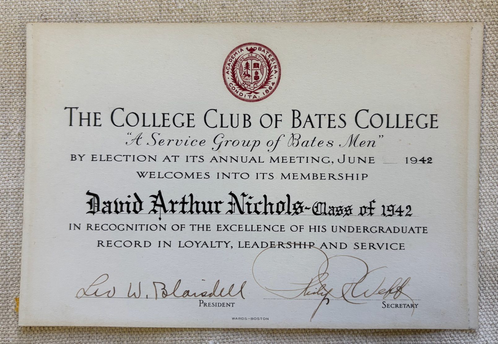 Membership Certificate from the College Club of Bates College to David Nichols Class of 1942Entry/Object ID