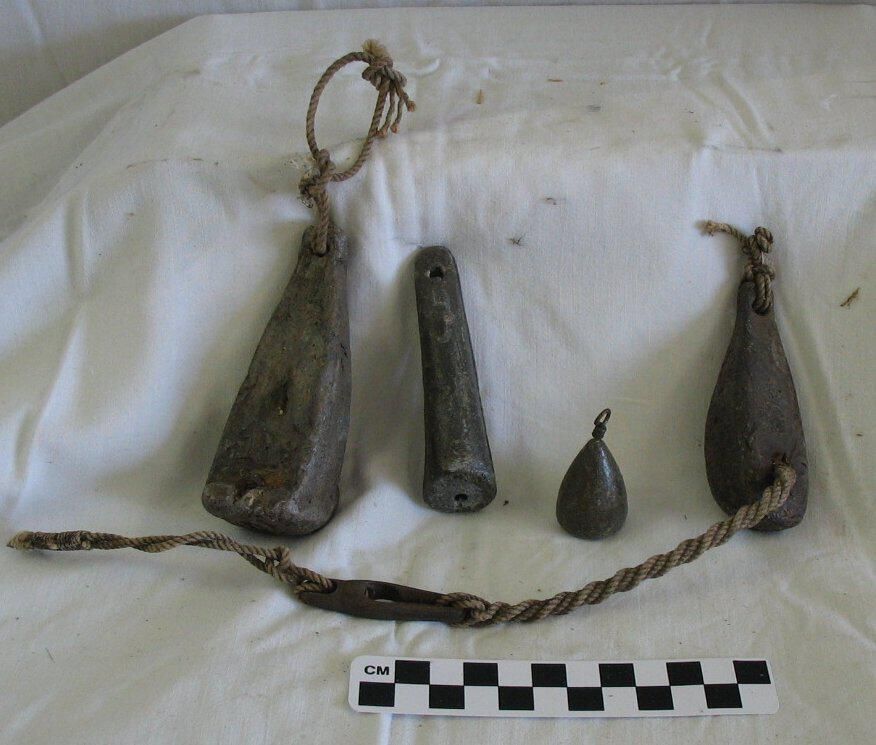 set of five lead sinkers used in fishing industry - several different weights and sizes