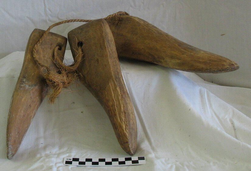 set of three hand-carved wooden shoe lasts, held together with a piece of twine, probably adult size