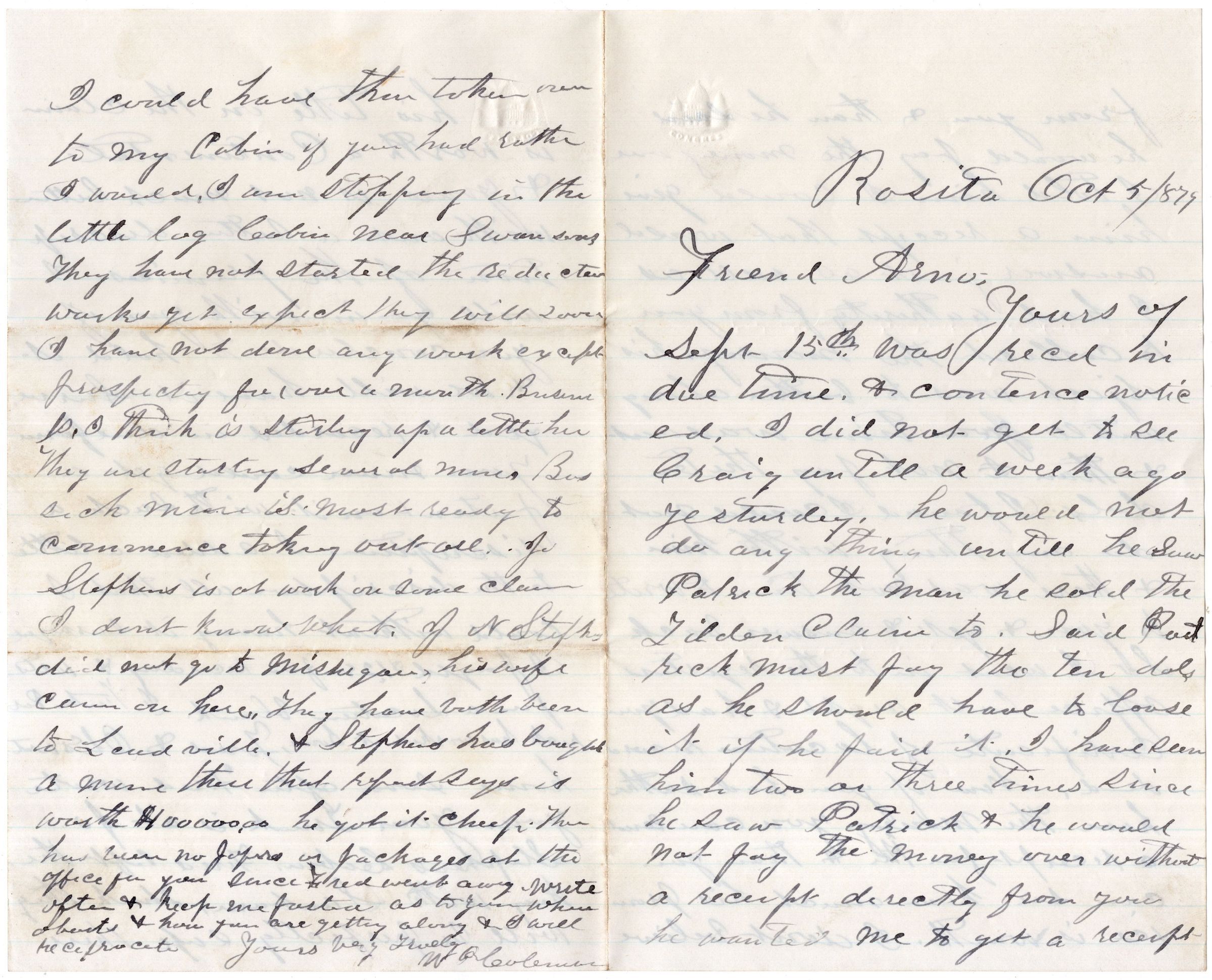 Knight Collection 1879 Letter; Dated October 5th; Written by W.S. Coleman to Arno Knight; they have been doing some business together; Arno has moved to Maysville and is working in a mine.Relationships