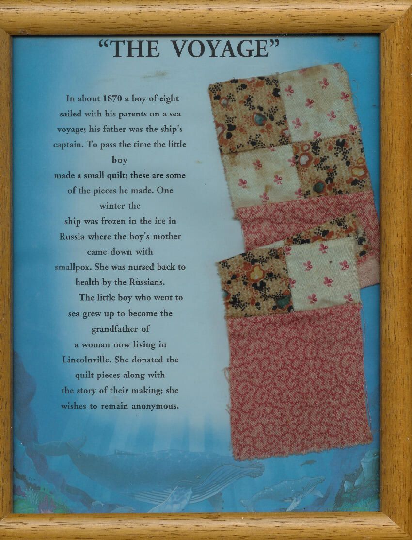 framed quilt pieces with a printed story calledl "The Voyage" refers to a boy who sailed with his parents in 1870 and became frozen in the ice. He made the little quilt.