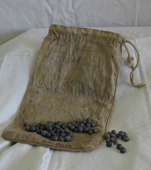 cloth bag with lead shot used in Civil War by Isaac Ames who returned with a lead ball in his body