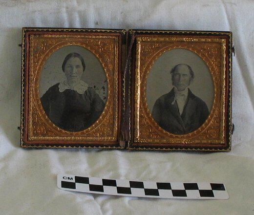 unknown man and woman in wooden folding decorative photo case