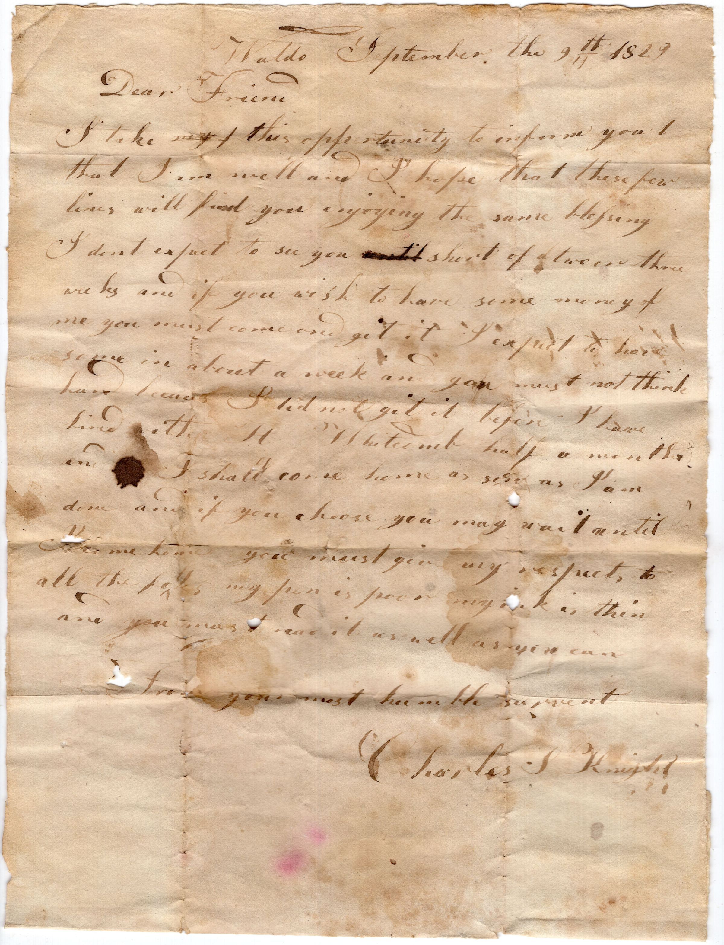 Knight Collection - Letter 1829; Dated September 9th; Written by Charles Knight to his brother Rufus KnightRelationships