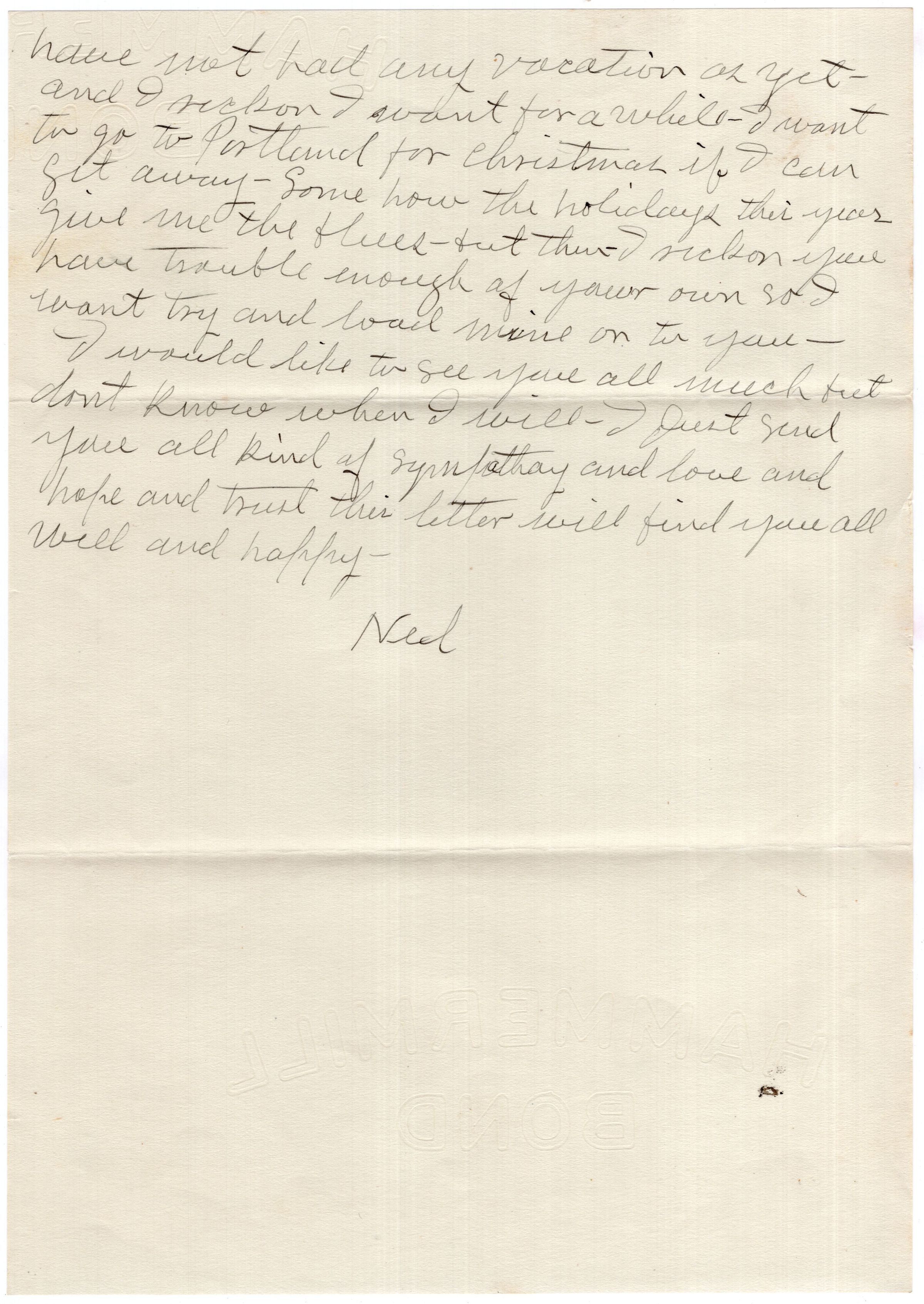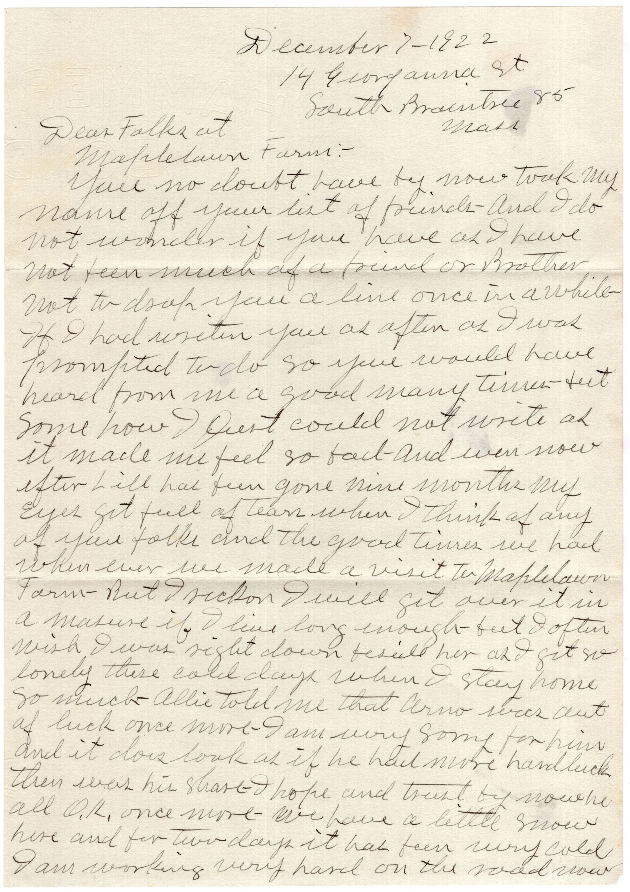 Knight Collection - 1922 Letter; Dated December 7; Written by Ned Barker to his brother-in-law Arno Knight and Olive Knight; Ned was married to Olive's sister Lillian Drinkwater who died in February 1922.Relationships